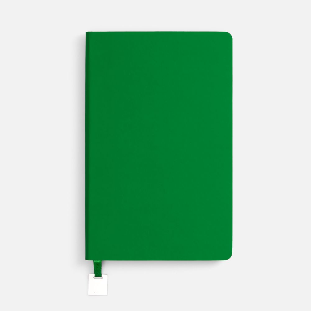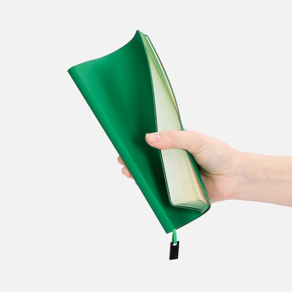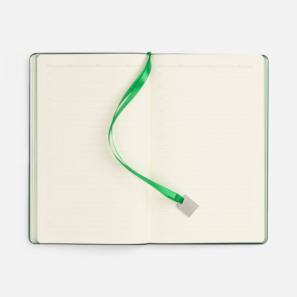 Ежедневник с гибкой обложкой, выполнен из материалов Soft Touch Ultra, зеленый FF, и Latte, зеленй (внутренняя часть обложки), дополнен ляссе в цвет обложки с металлическим шильдиком.
