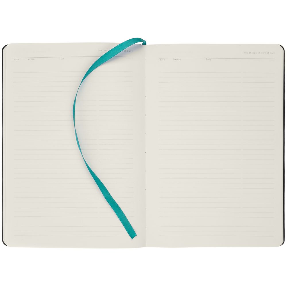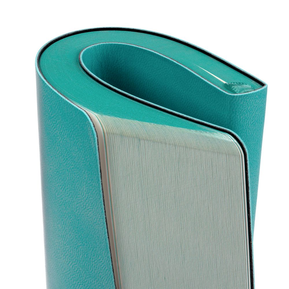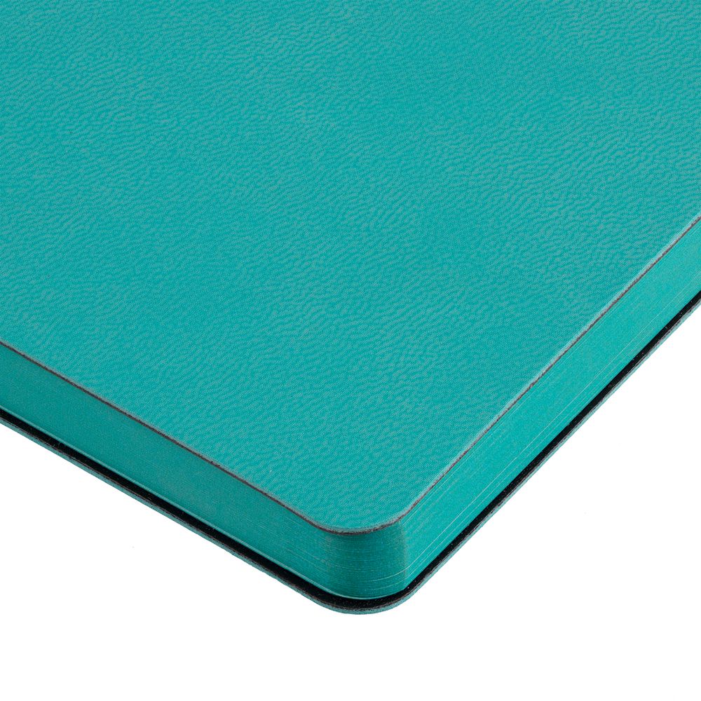 Ежедневник с гибкой обложкой, выполнен из материала Latte, бирюзовый, дополнен ляссе в цвет обложки.