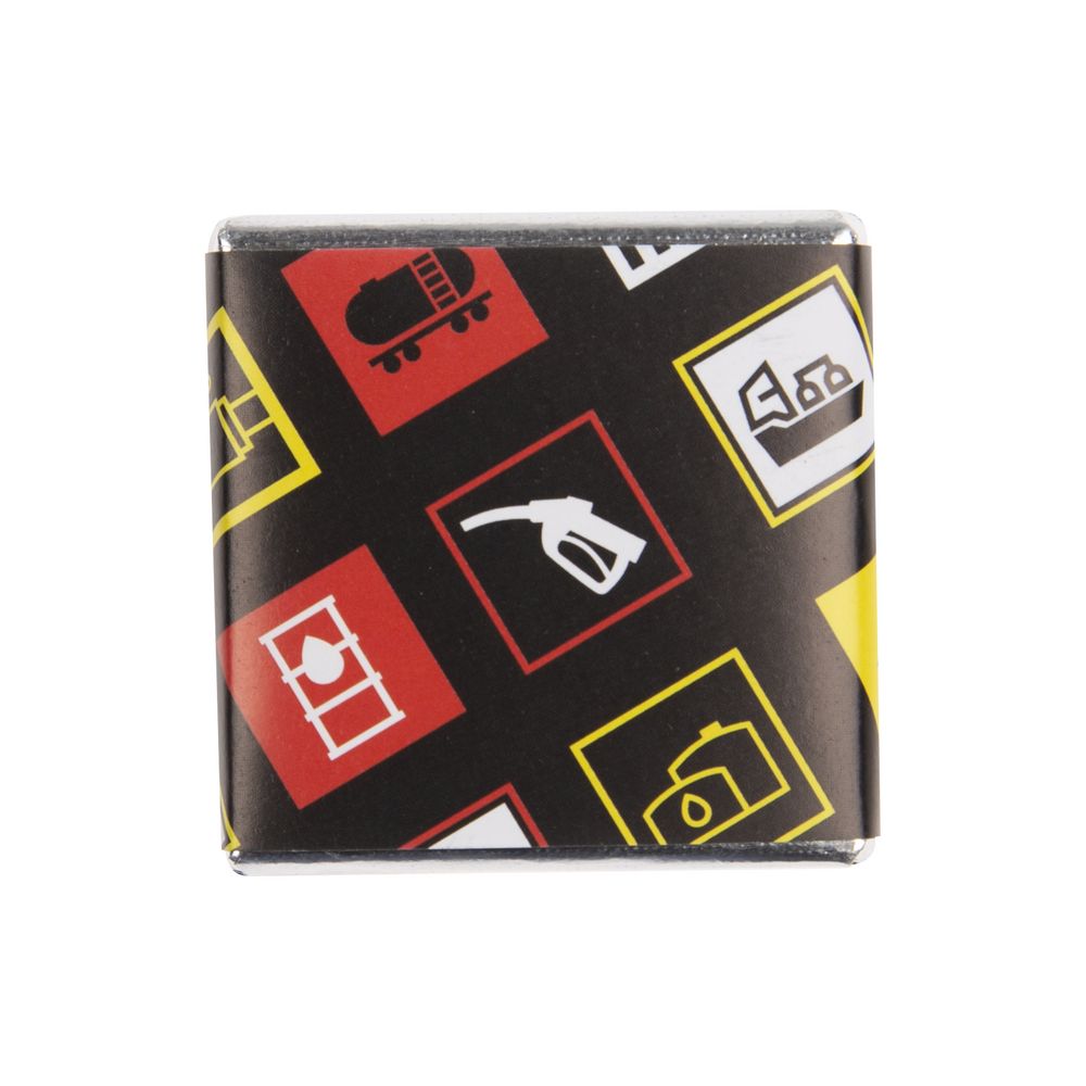 На обратной стороне каждой плитки изображены главные символы нефтегазовой промышленности. Шоколад горький, 60% какао. В набор входит 16 плиток по 5 г. Срок годности 12 месяцев.