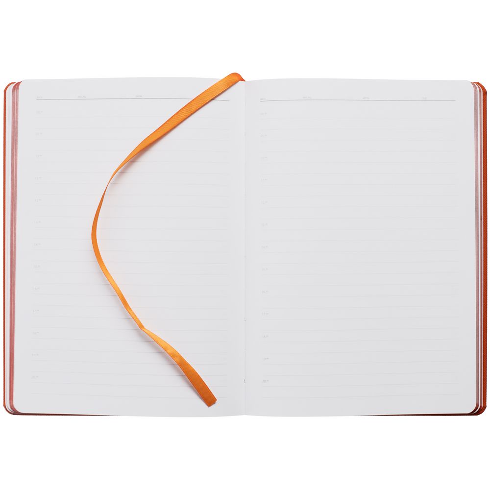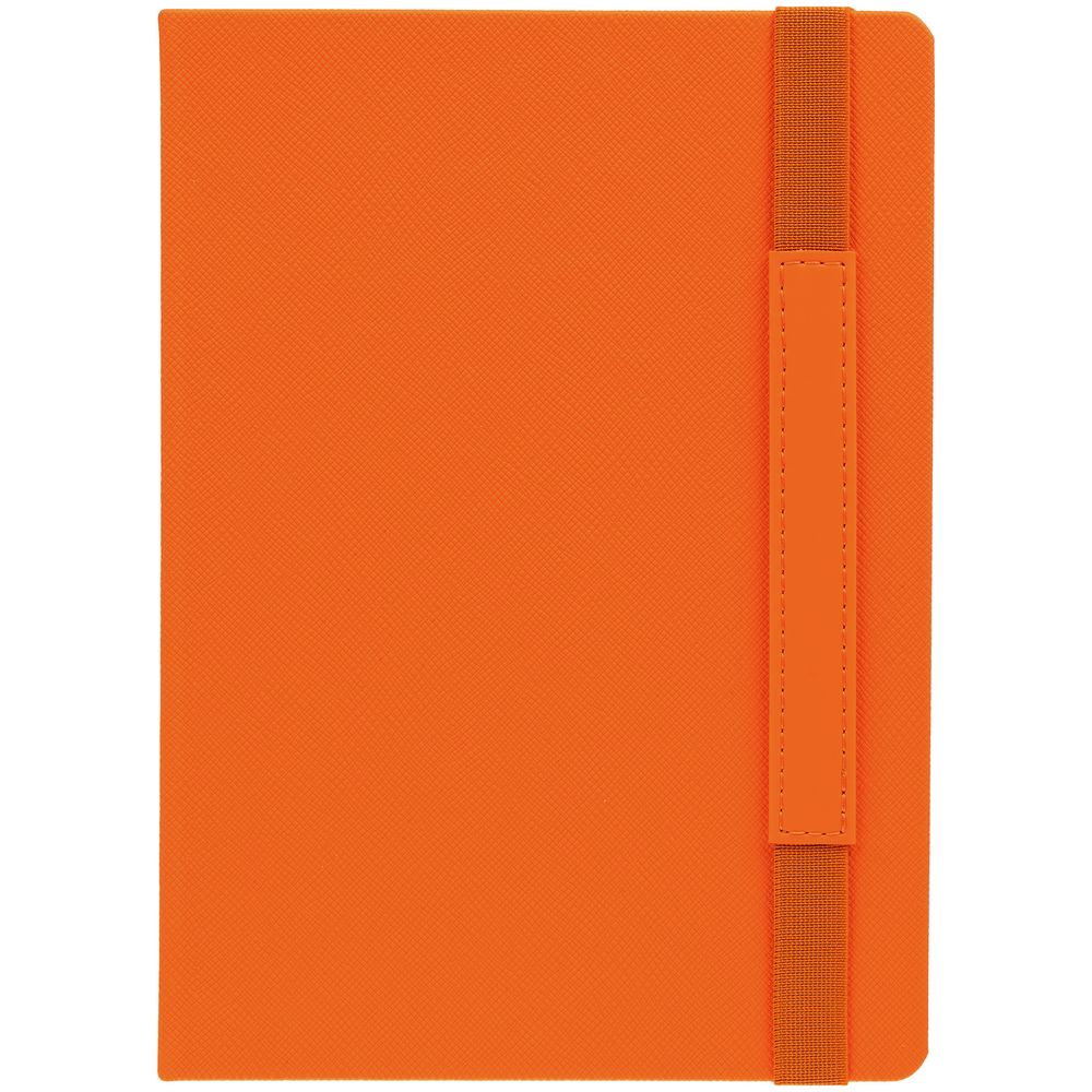 Ежедневник с твердой обложкой, выполнен из материала Nice Touch, оранжевый ОО, дополнен резинкой с лейблом из материала Soft Touch и ляссе в цвет обложки.