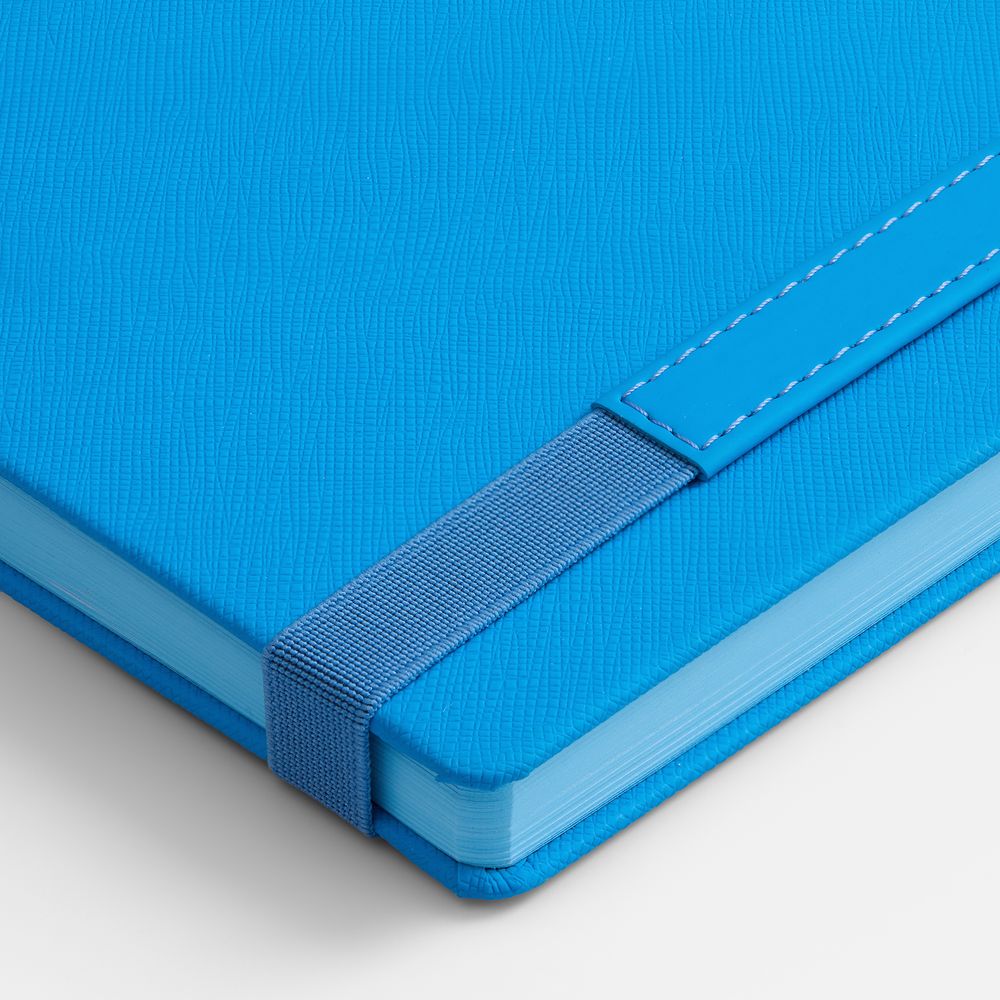 Ежедневник с твердой обложкой, выполнен из материала Nice Touch, голубой JJ, дополнен резинкой с шильдой из материала Soft Touch Ultra и ляссе в цвет обложки.