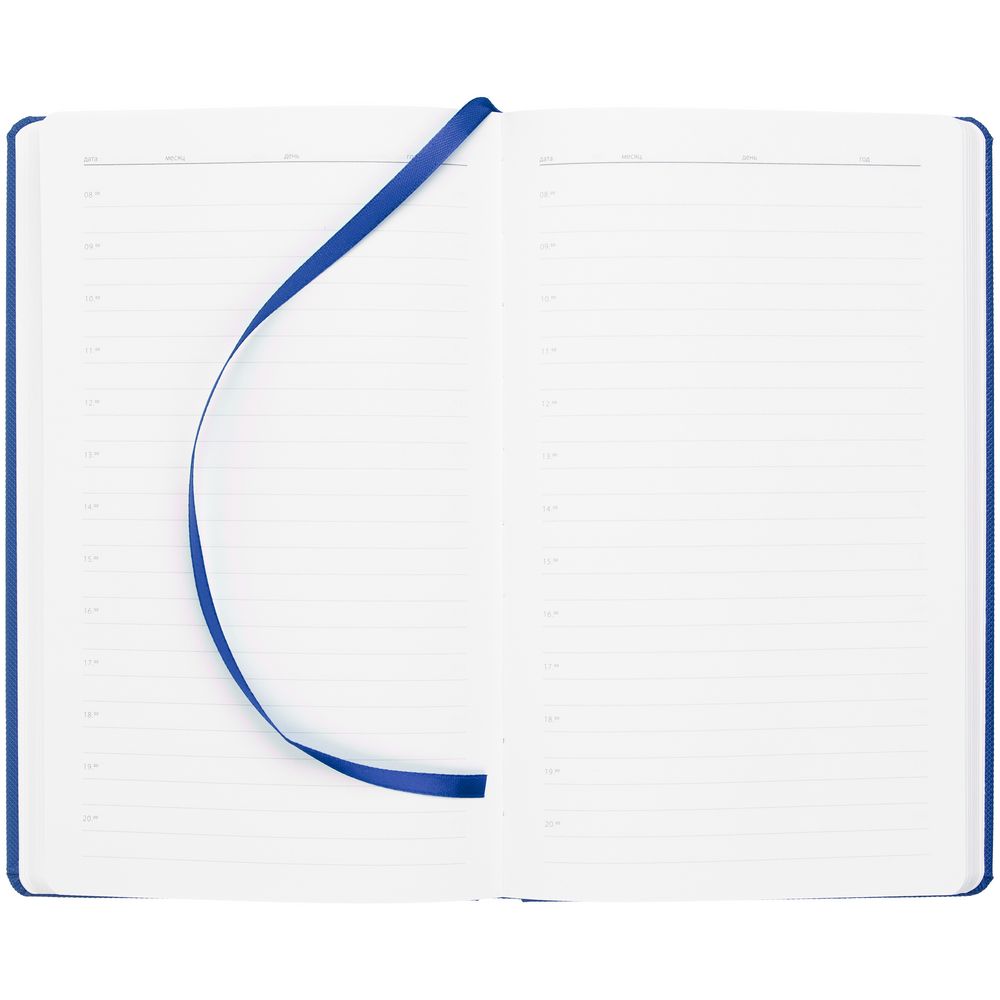 Ежедневник с твердой обложкой, выполнен из материала Canyon, синий НН, дополнен ляссе в цвет обложки.