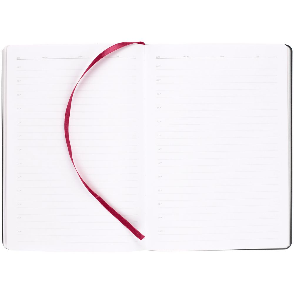 Модная интерпретация статусного ежедневника — с металлизированным обрезом и гибкой обложкой. Ежедневник с гибкой обложкой, выполнен из материала Nebraska, винный SS, дополнен ляссе бордового цвета.