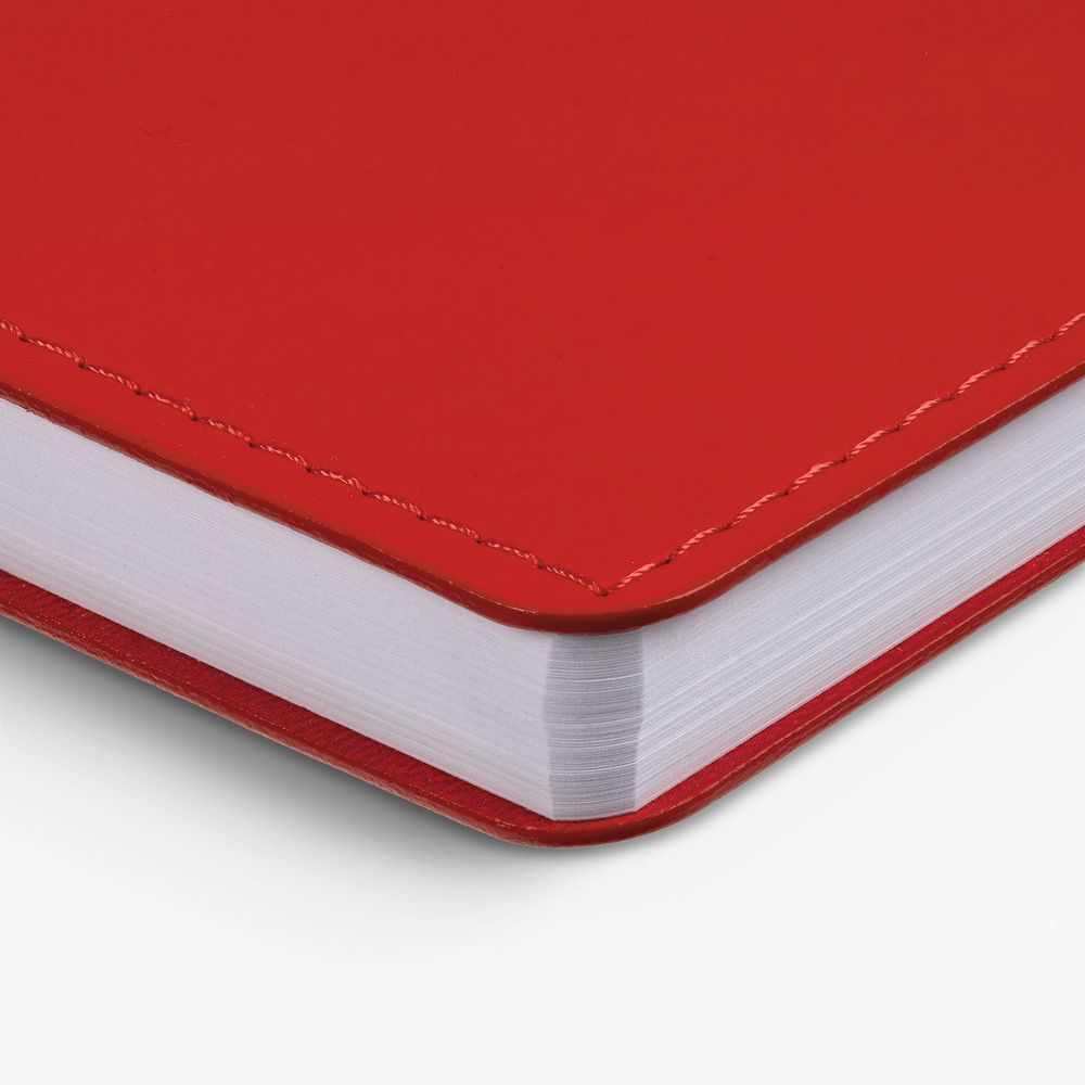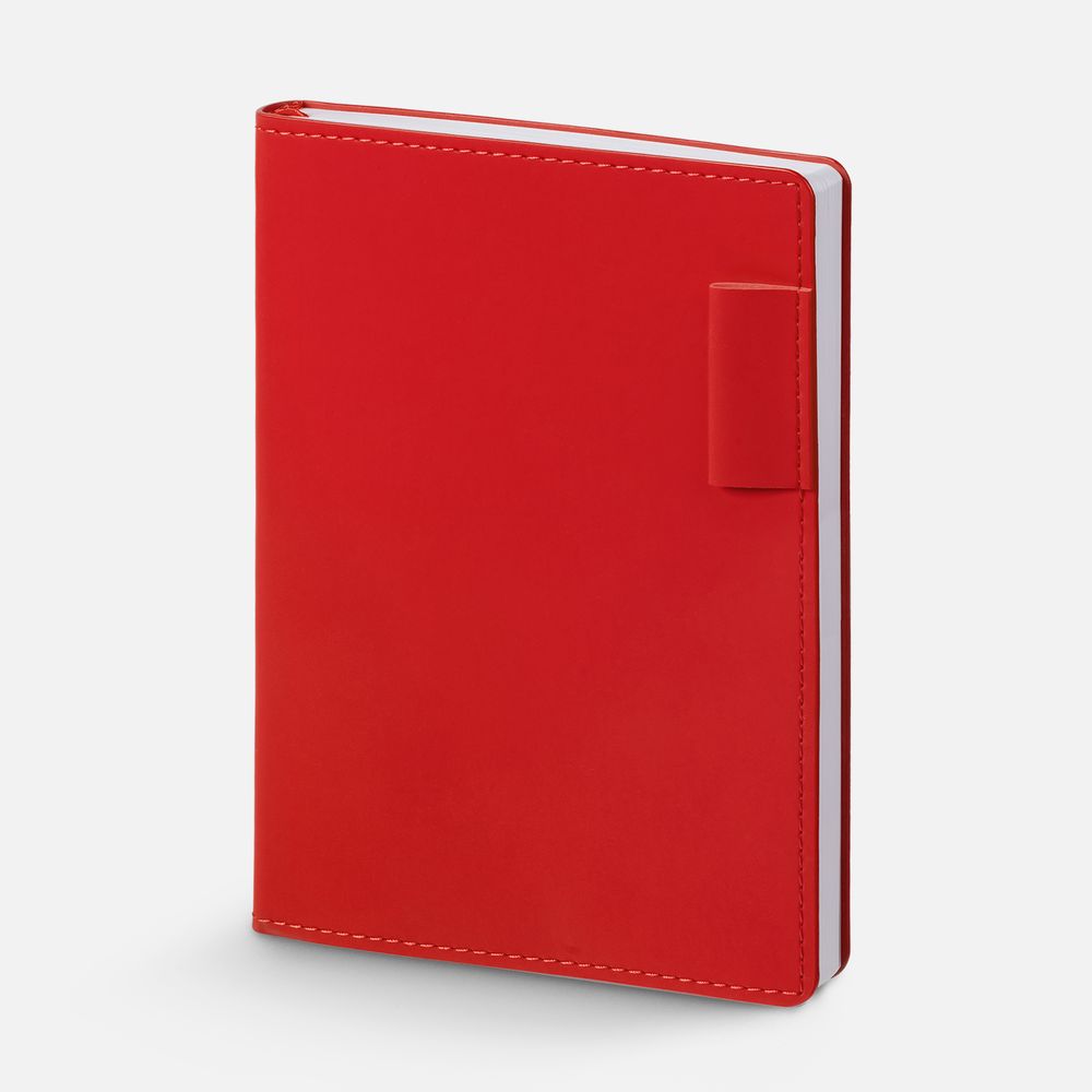 Ежедневник с гибкой обложкой из материала Soft Touch Ultra, красный РР и Latte, красный (внутренний материал), дополнен петелькой для ручки из покровного материала, капталом, ляссе и закрашенным срезом обложки в цвет материала.