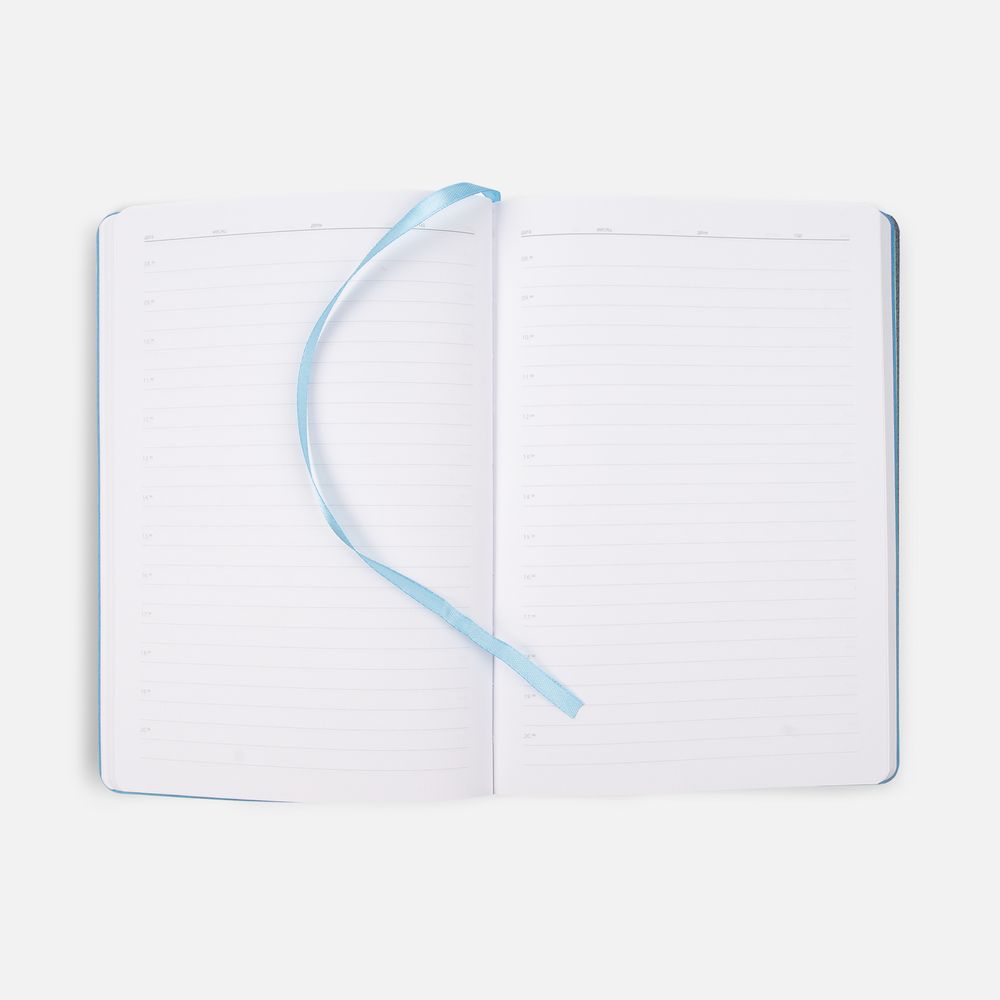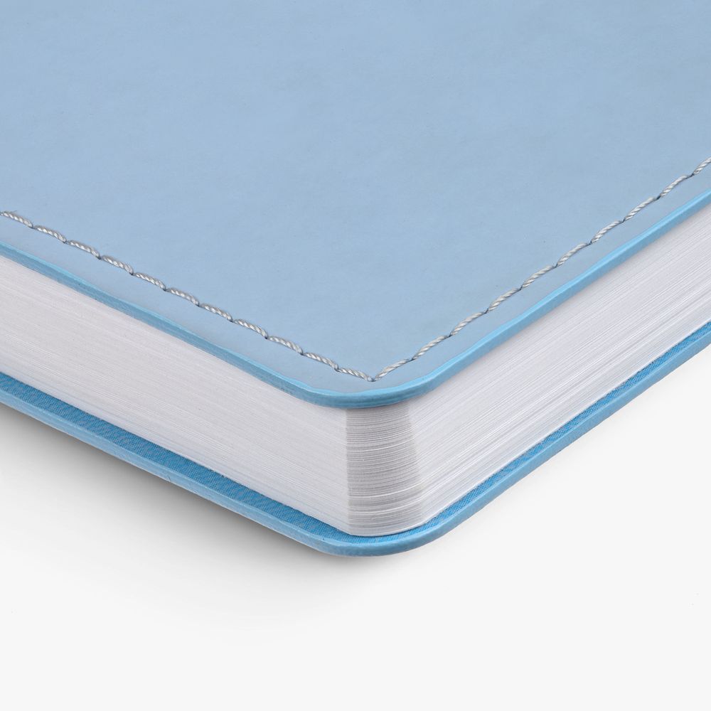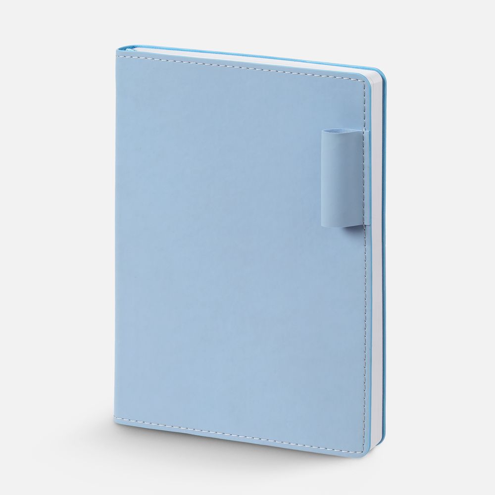 Ежедневник с гибкой обложкой из материала Soft Touch, голубой и Latte, голубой (внутренний материал), дополнен петелькой для ручки из покровного материала, капталом, ляссе и закрашенным срезом обложки в цвет материала.
