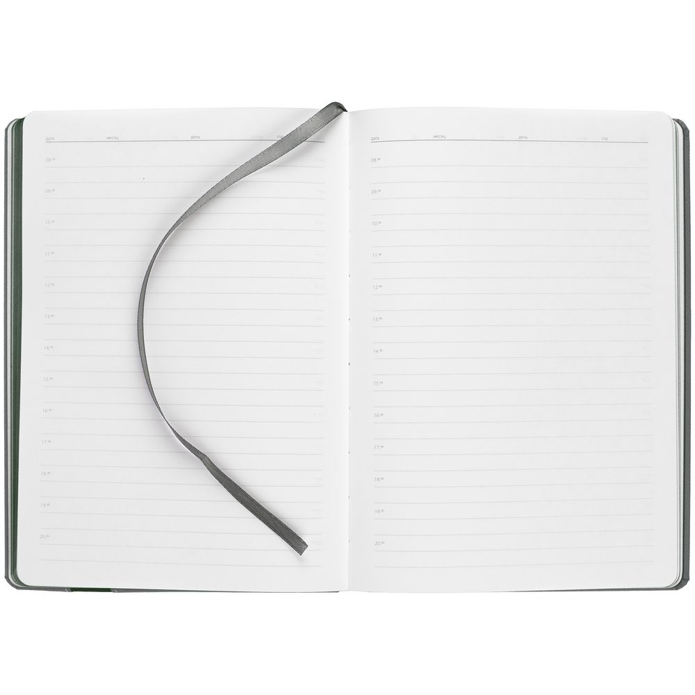 Ежедневник с твердой обложкой и тонированным обрезом. Выполнен из материала Nice Touch, серый СС, и Soft Touch Ultra, зеленый FF, дополнен серым ляссе.