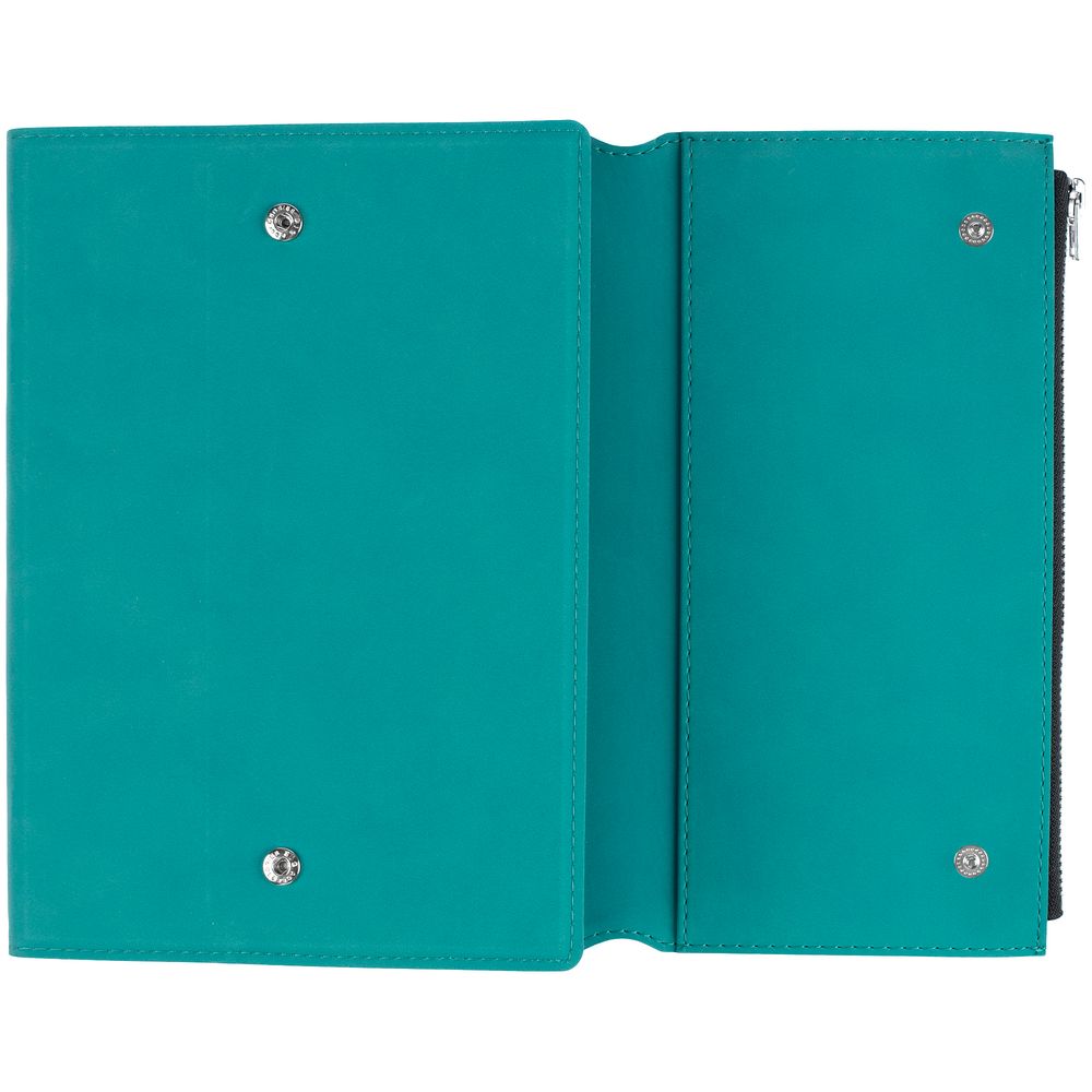 Ежедневник в гибкой суперобложке c карманом на молнии, выполнен из материала Nubuck, цвет морской волны II. Дополнен капталом и металлической шильдой на ляссе серого цвета.