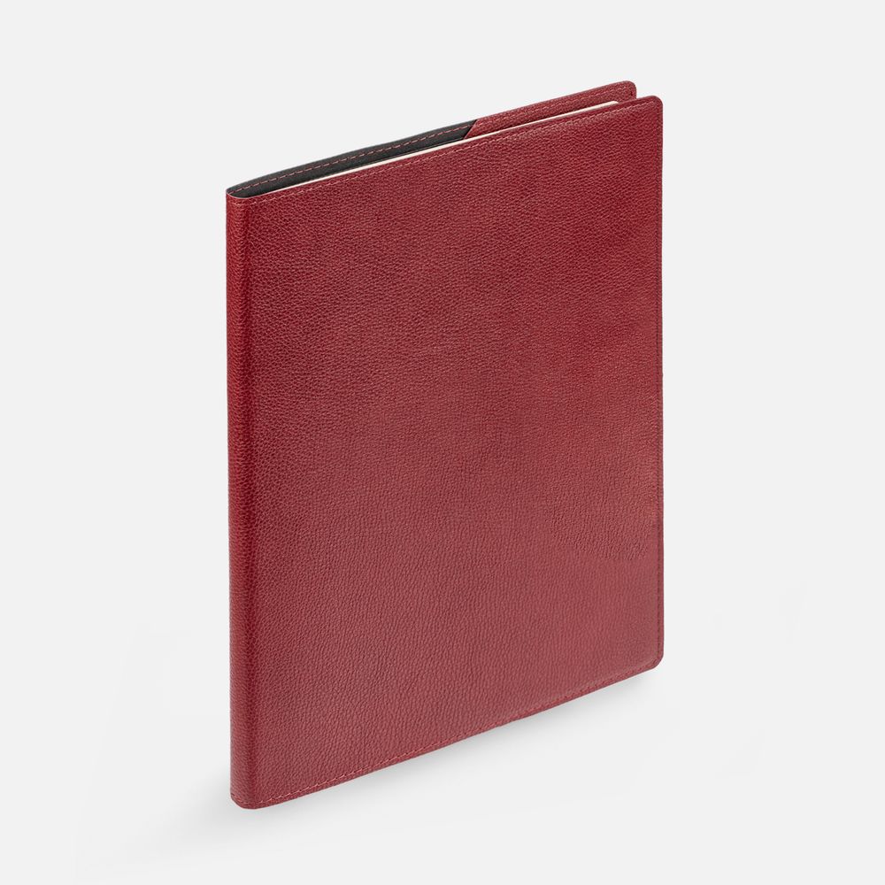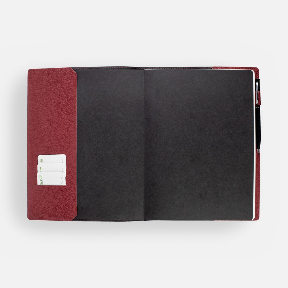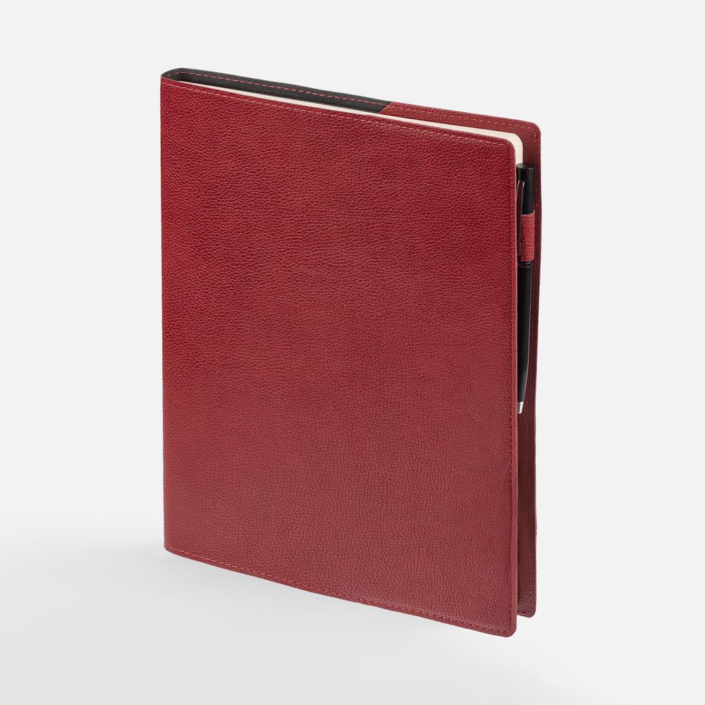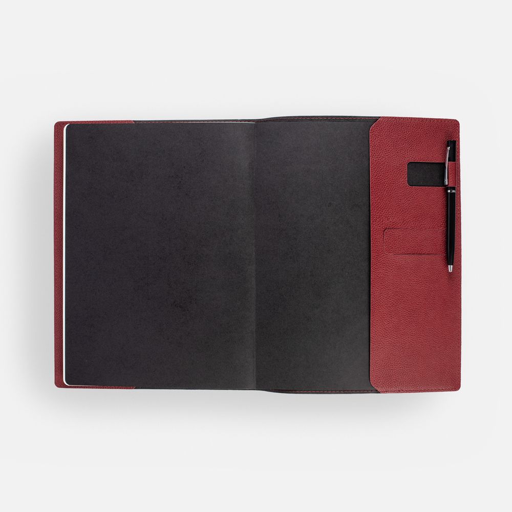 Ежедневник в суперобложке выполнен из материала La Fite, красный РР, дополнен ляссе и капталом черного цвета.