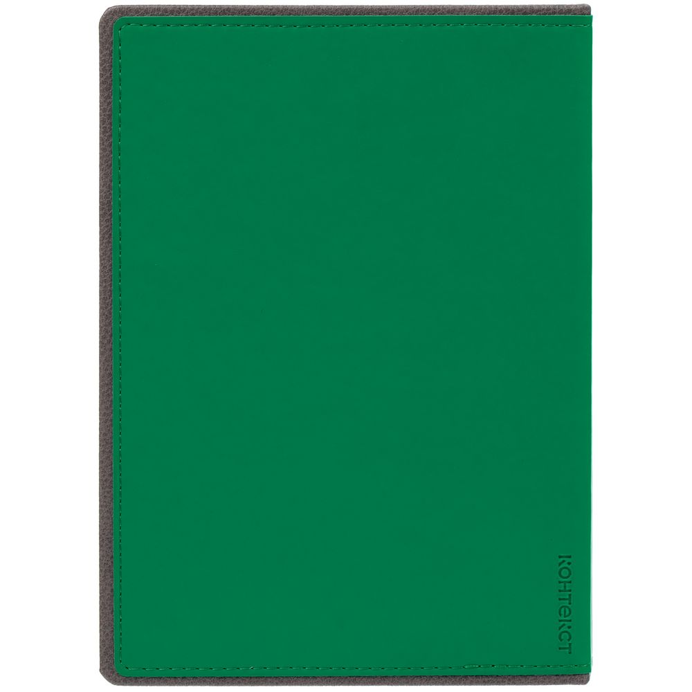 Ежедневник с твердой обложкой, выполнен из материалов Soft Touch Ultra, зеленый FF и La Fite, серый СС. Ляссе темно-серого цвета.