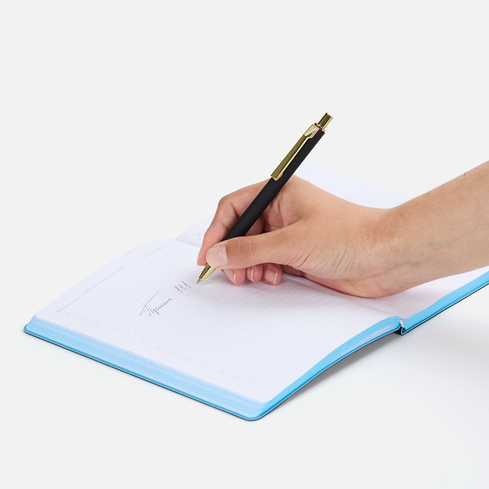 Шариковая ручка с покрытием софт-тач и золотистыми деталями. Клип оригинальной формы.