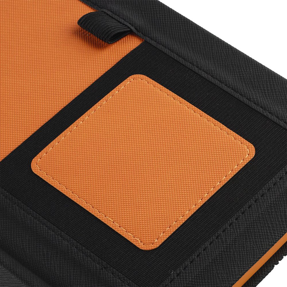 Твердая обложка выполнена из материалов Nice Touch, черный АА, и Canyon, оранжевый ОО. Ежедневник дополнен капталом, резинкой для ручки и ляссе черного цвета.
