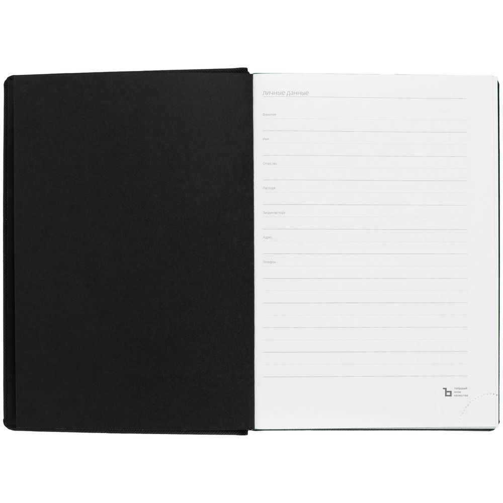 Твердая обложка выполнена из материалов Nice Touch, черный АА, и Canyon, зеленый FF. Ежедневник дополнен капталом, резинкой для ручки и ляссе черного цвета.