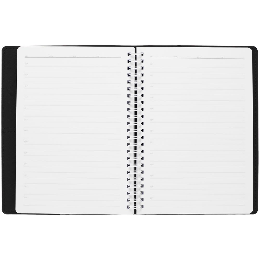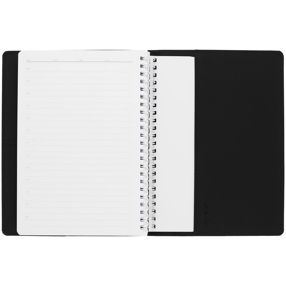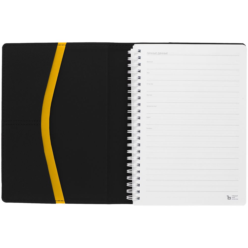 Ежедневник с блоком на пружине в твердой обложке, выполнен из материалов Nice Touch, черный АА и Soft Touch желтый.