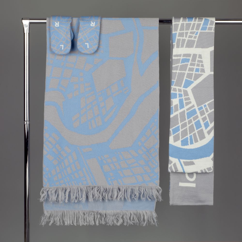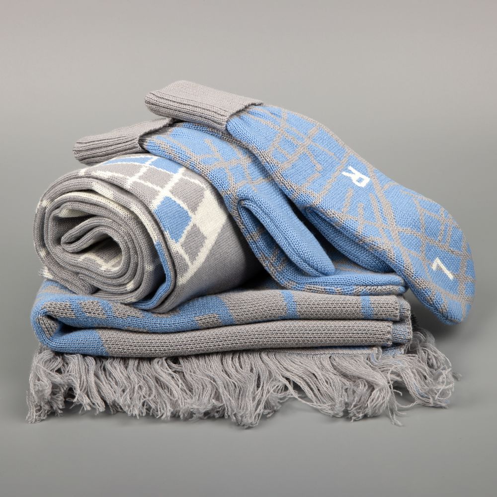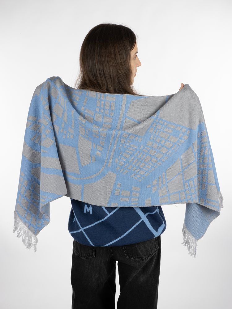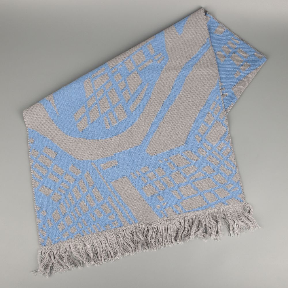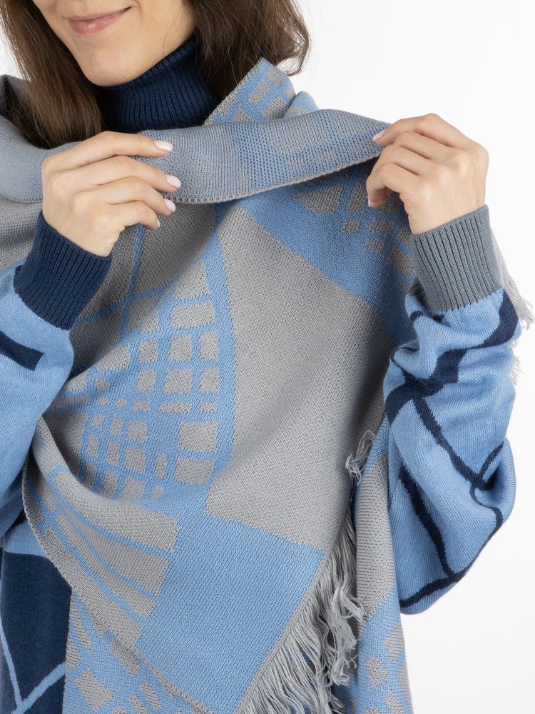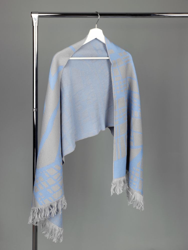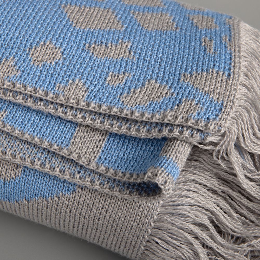 Палантин с пестрой бахромой с вывязанным логотипом и индивидуальным рисунком в фирменной цветовой гамме.