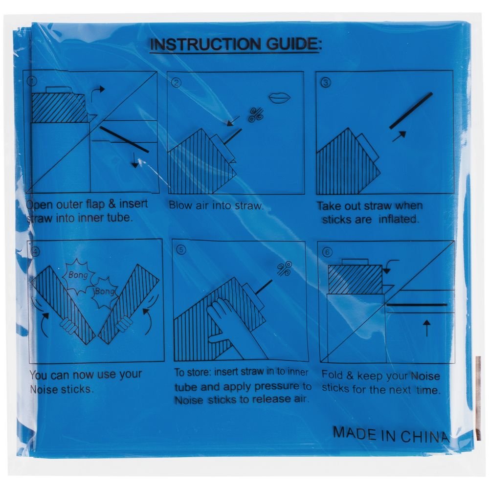 1. Достаньте палки-стучалки из пакета и расправьте. 2. Вставьте трубочку между стенками воздушного клапана. 3. Надуйте. 4. Выньте трубочку из клапана — он закроется автоматически и палки-стучалки не будут самопроизвольно сдуваться. 5. Чтобы сдуть палки-стучалки, снова вставьте трубочку в клапан и аккуратно спустите воздух.