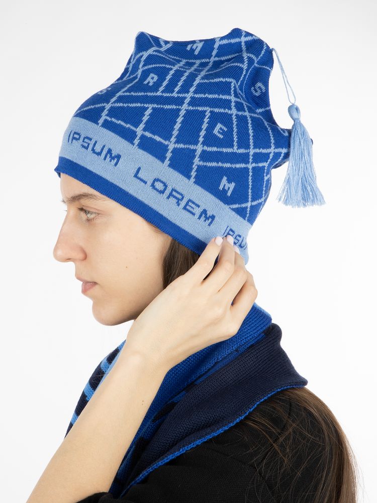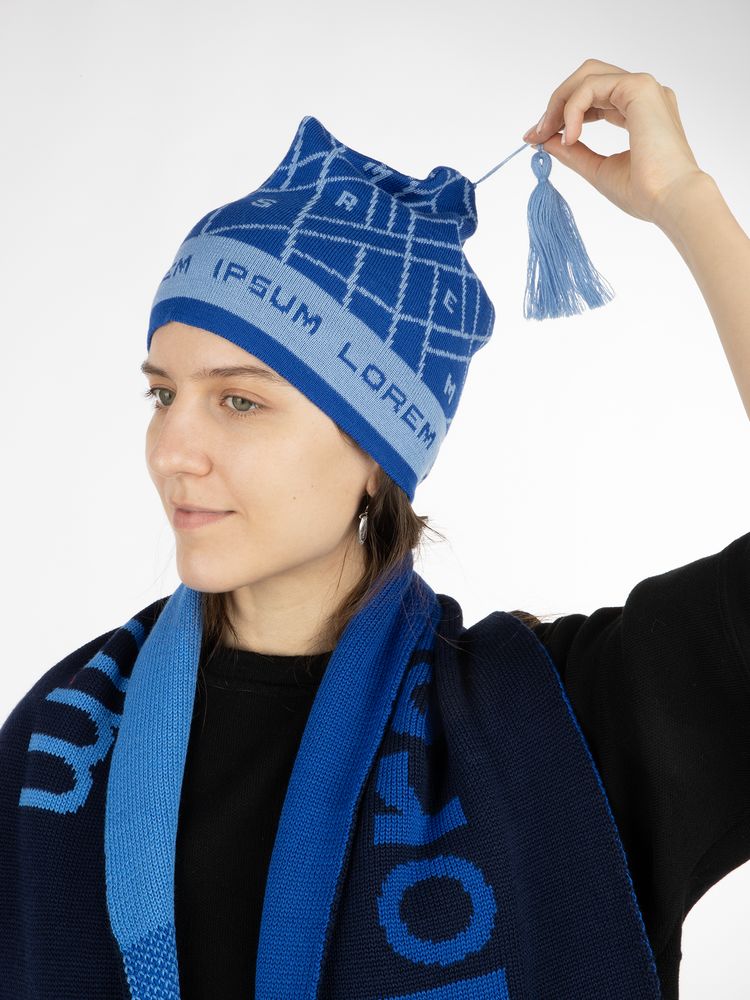 Шапка-петушок с вывязанным логотипом и индивидуальным рисунком в фирменной цветовой гамме.