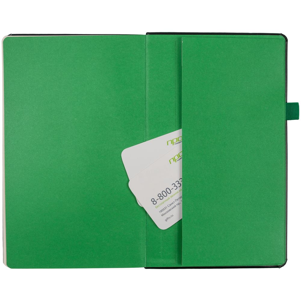 Ежедневник с твердой обложкой, выполнен из материала Waltz, черный АА, дополнен зеленой резинкой с металлическим шильдом и ляссе.