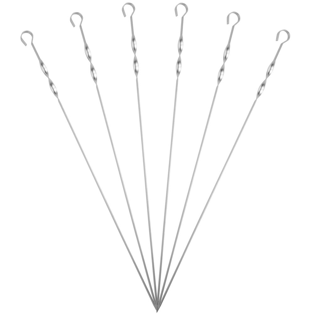 Длинные шампуры подходят для мангалов шириной до 40 см. Спираль у рукоятки позволяет фиксировать шампур при переворачивании шашлыка во время приготовления. В набор входят: 6 металлических шампуров, чехол из нейлона.