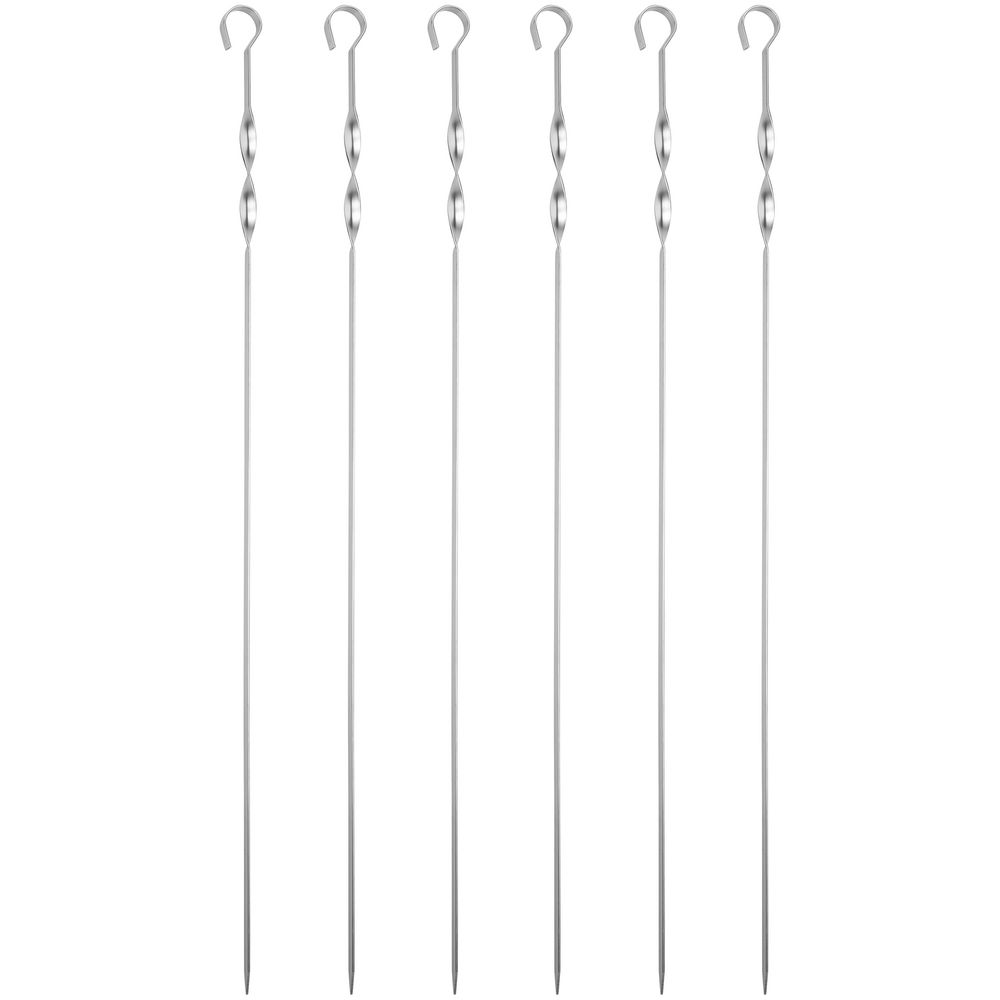Длинные шампуры подходят для мангалов шириной до 40 см. Спираль у рукоятки позволяет фиксировать шампур при переворачивании шашлыка во время приготовления. В набор входят: 6 металлических шампуров, чехол из нейлона.