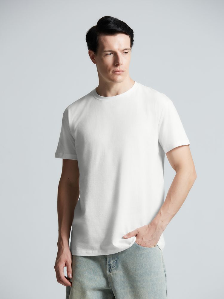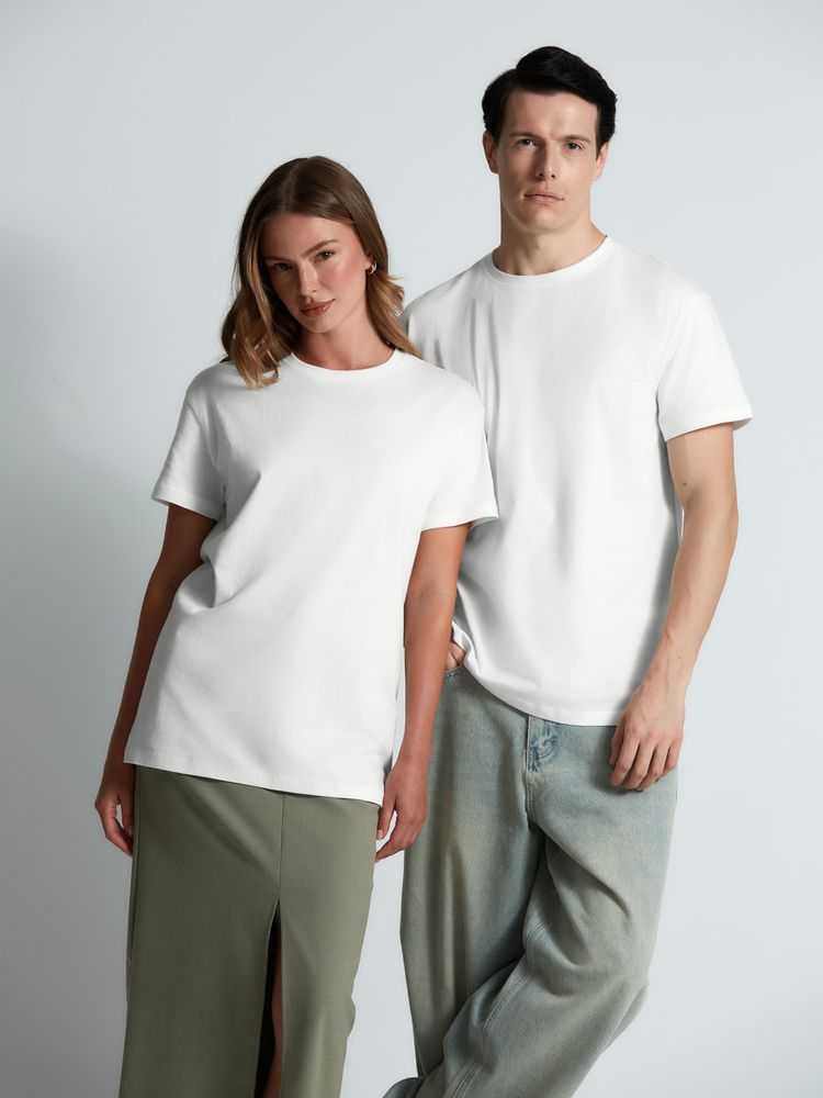 Базовая футболка унисекс прямого силуэта без боковых швов (размеры XS–4XL) или с боковыми швами (размеры 5XL–6XL).
