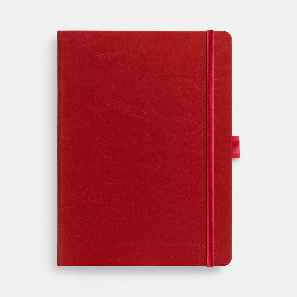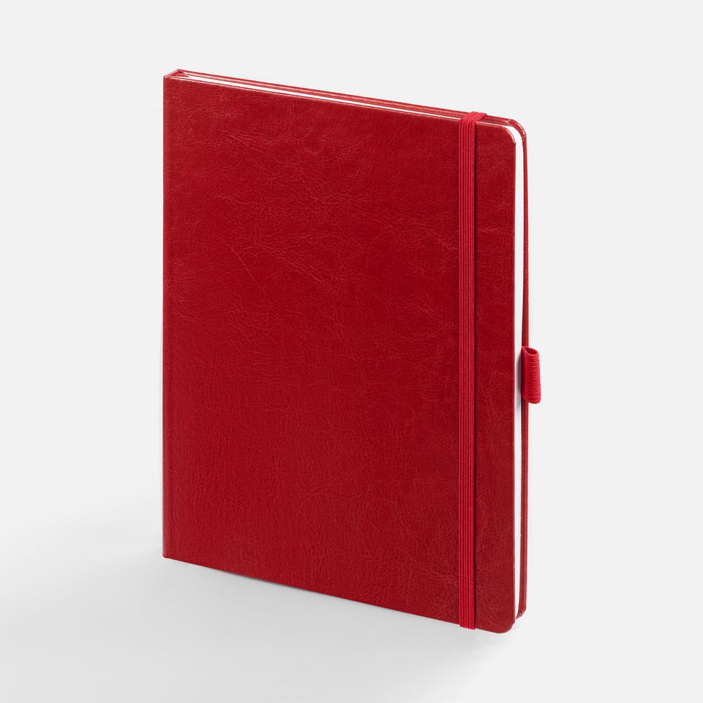 Еженедельник в твердой обложке выполнен из материала Nebraska, красный РР, дополнен резинкой, петлей для ручки и ляссе красного цвета.