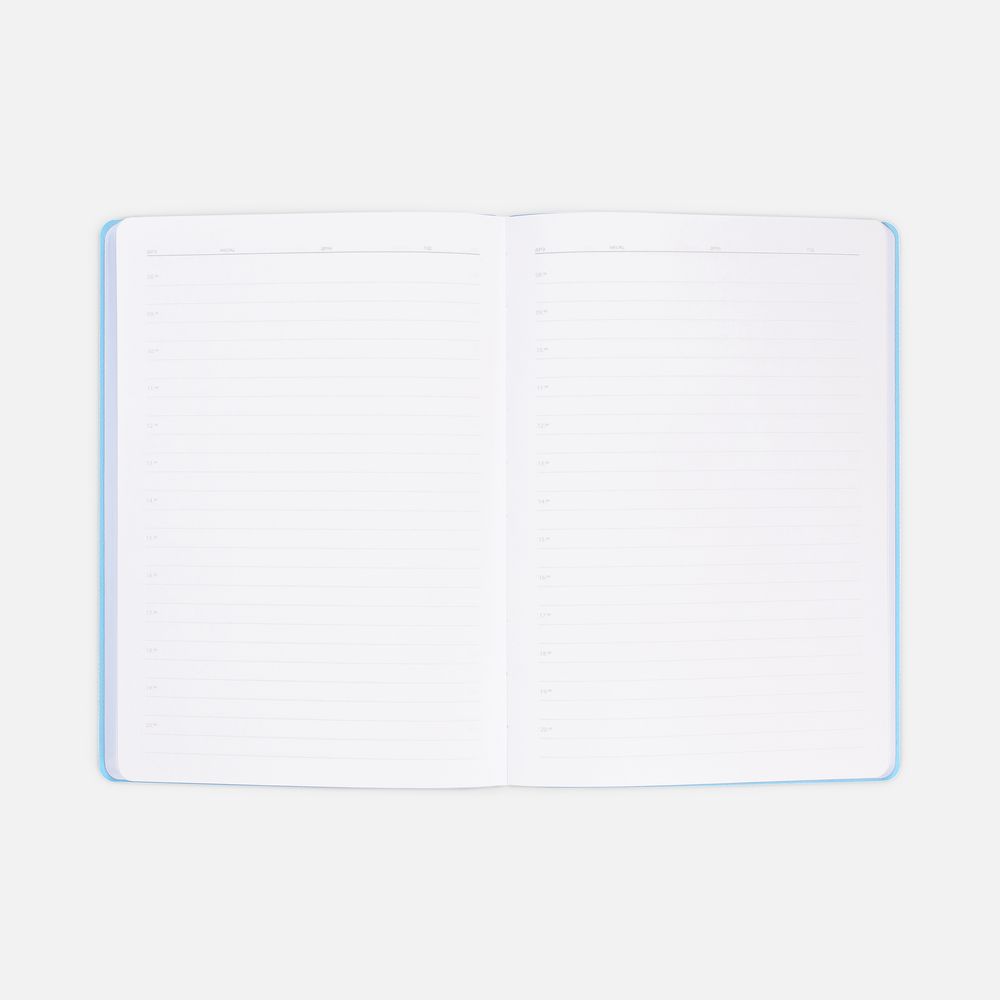 Гибкая обложка выполнена из материала Soft Touch, голубой JJ и Latte, голубой JJ (внутренняя часть обложки). Внутри корешка — специальное место для крепления ручки размером до 15х1 см.