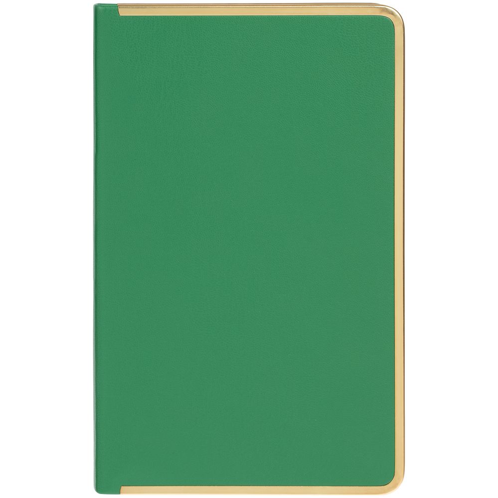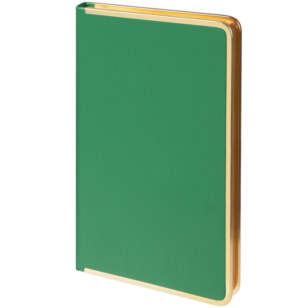 Изящный ежедневник с зауженным блоком и стильными деталями — металлической окантовкой на обложке и металлизированным обрезом.