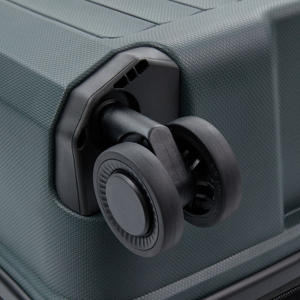 Блок крепления колеса встроен в корпус чемодана, что обеспечивает лучшую устойчивость к внешнему воздействию