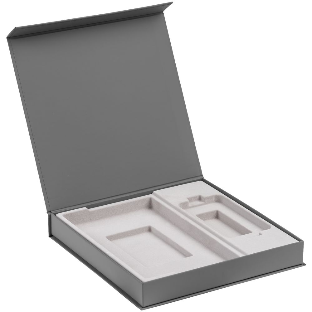 Подарочная коробка из переплетного картона, кашированного дизайнерской софт-тач бумагой Plake, с одной створкой на магните. Подходит для набора из ежедневника 13x21 см и аккумулятора 12,5x6,5 см. Конструкция коробки предусматривает наличие технологического зазора шириной до 2 мм по линии сопряжения короба и крышки.