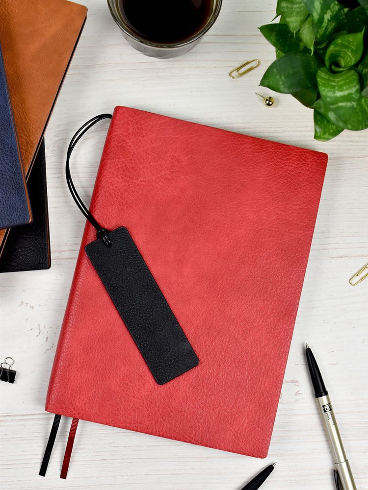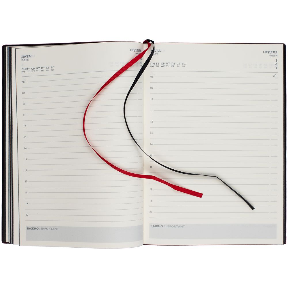 Ежедневник с гибкой обложкой и закладкой из искусственной кожи, дополнен капталом и двойным ляссе.