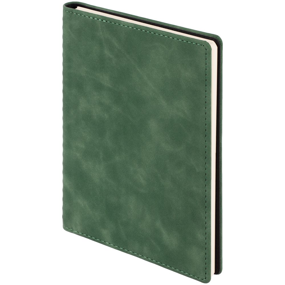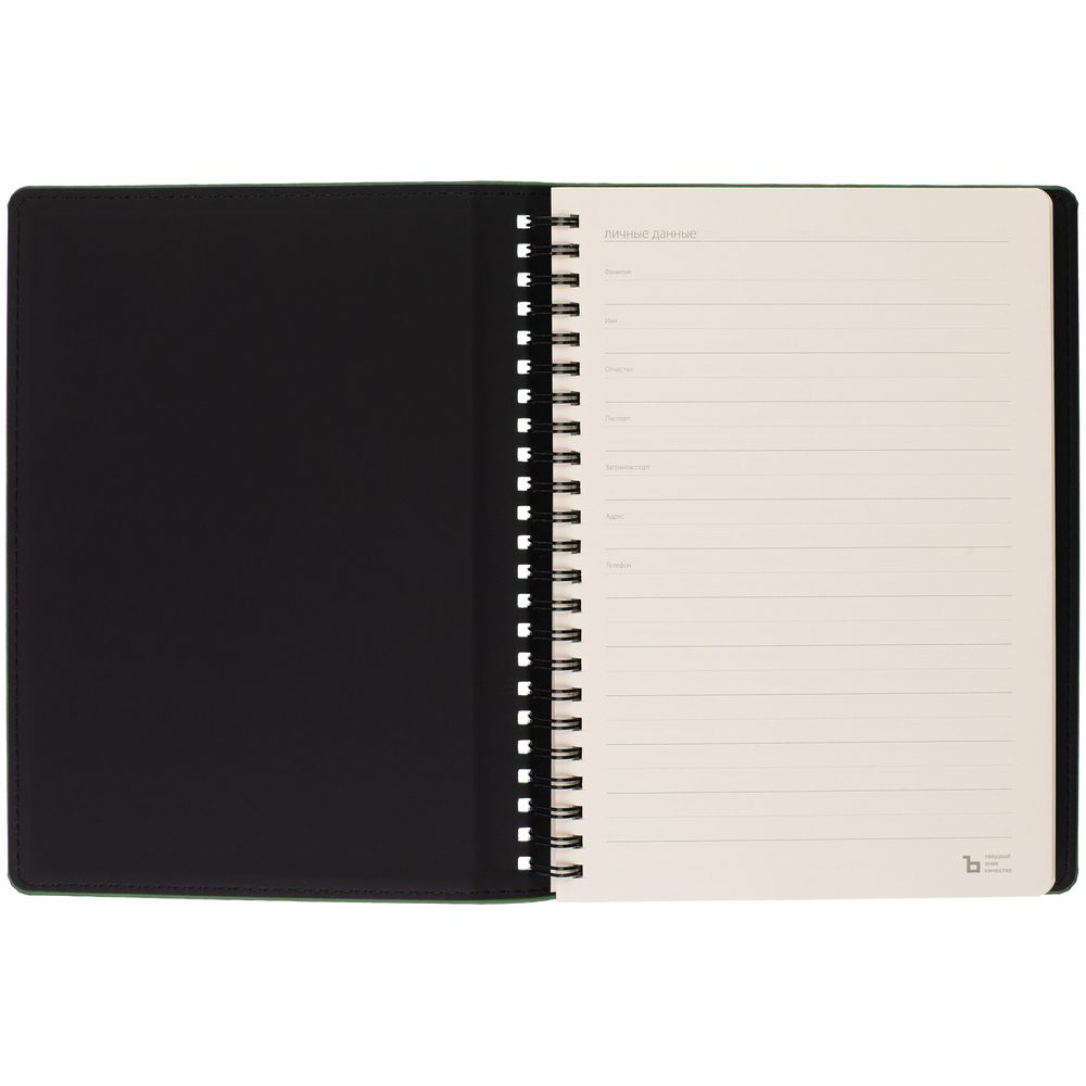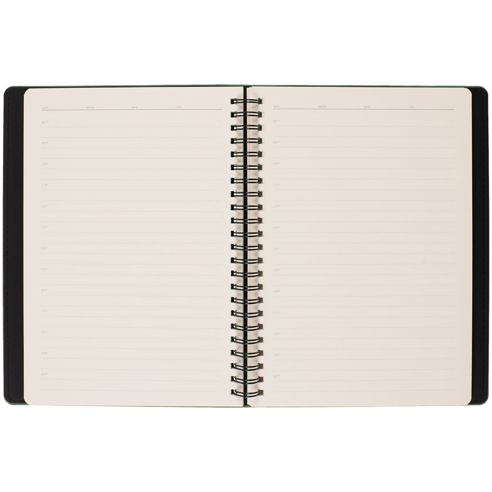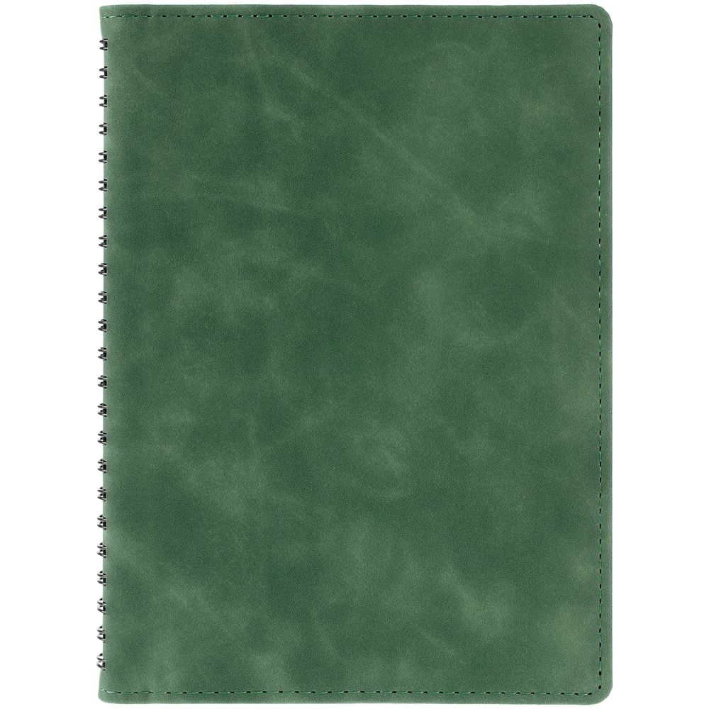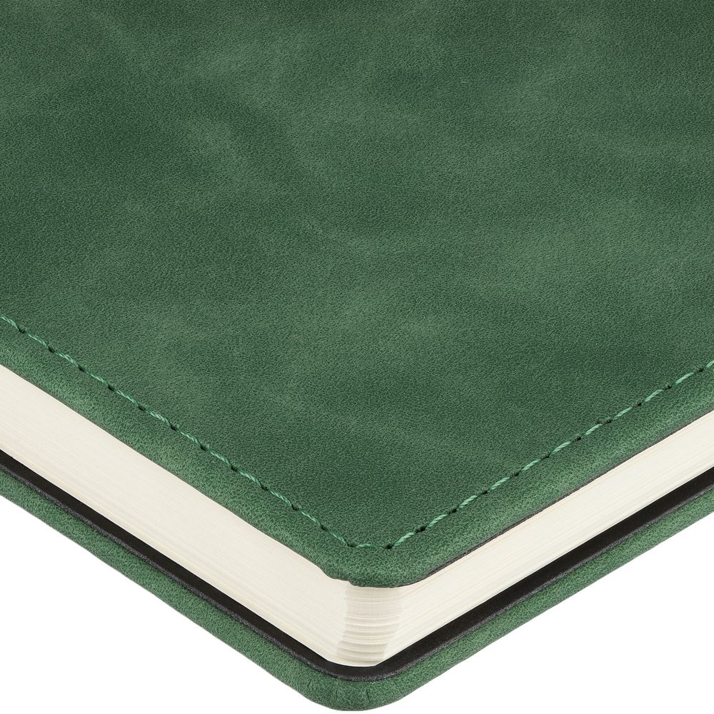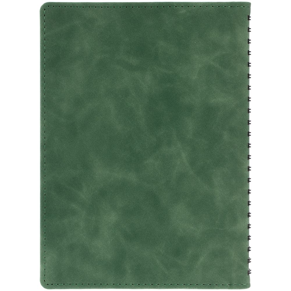 Ежедневник с блоком на пружине в твердой обложке, выполнен из материалов Nubuk Touch, зеленый FF и Soft Touch, черный AA.