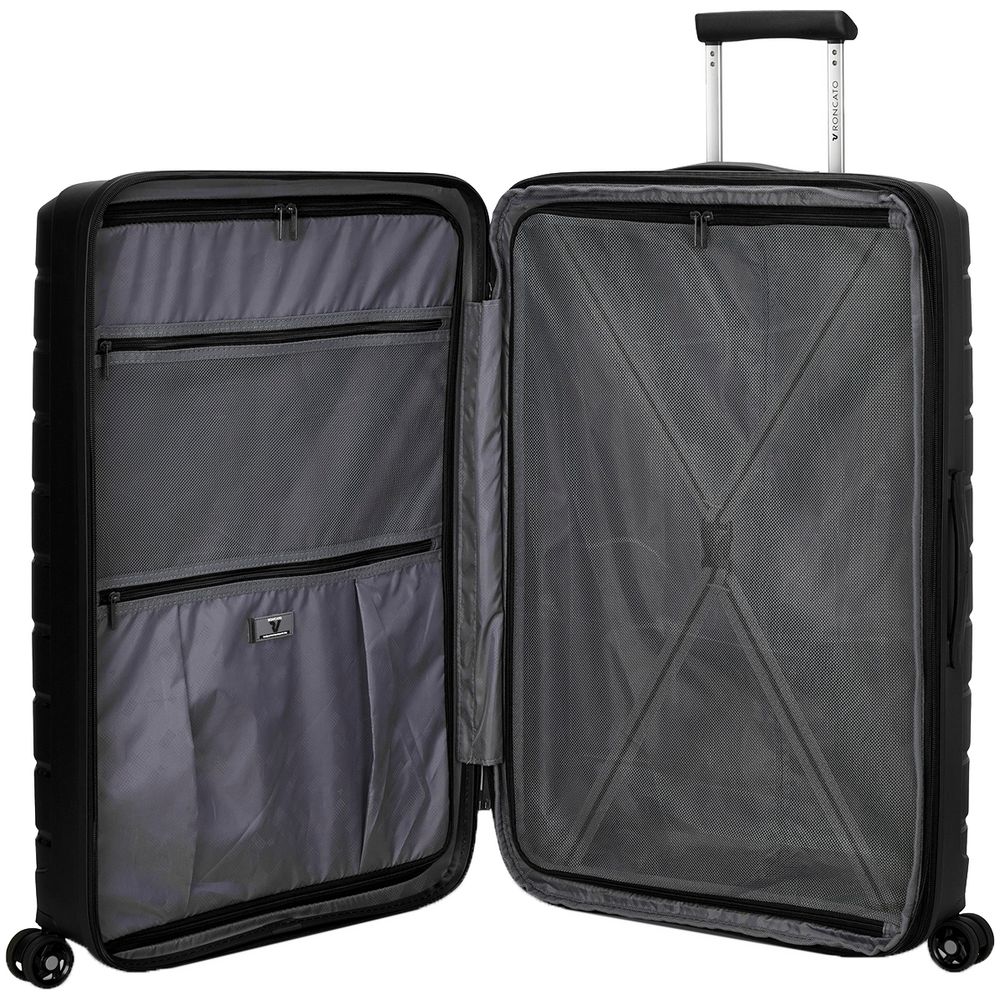 Чемодан с 2 отделениями: одно отделение с сетчатым разделителем и прижимными ремнями, а второе оснащено перегородкой на молнии с двумя карманами
