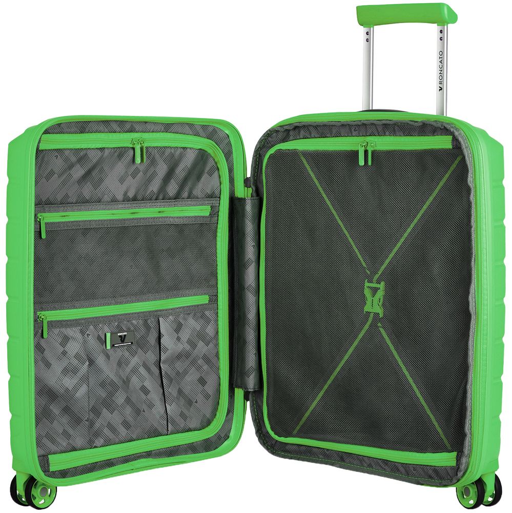 • Чемодан с 2 отделениями: одно отделение с сетчатым разделителем и прижимными ремнями, а второе оснащено перегородкой на молнии с двумя карманами