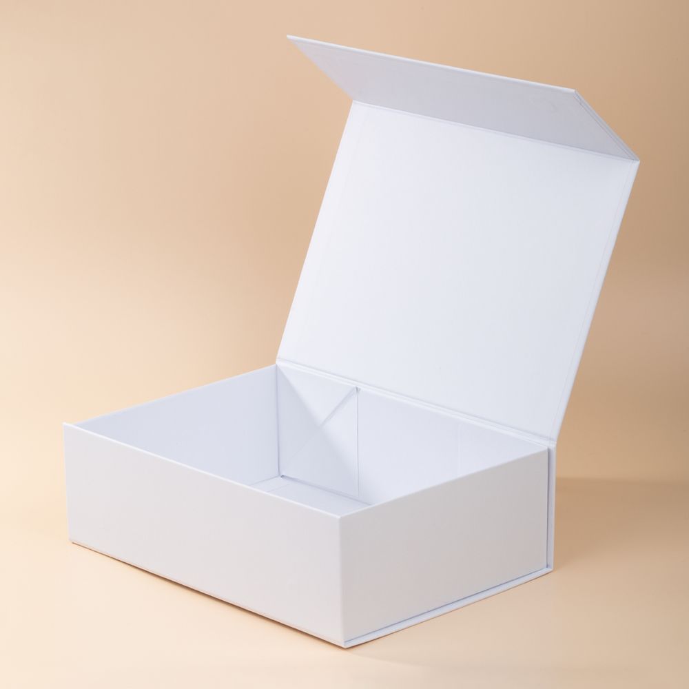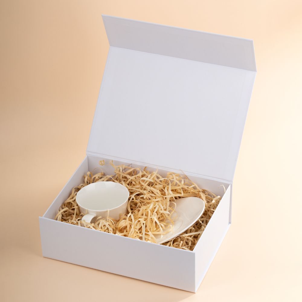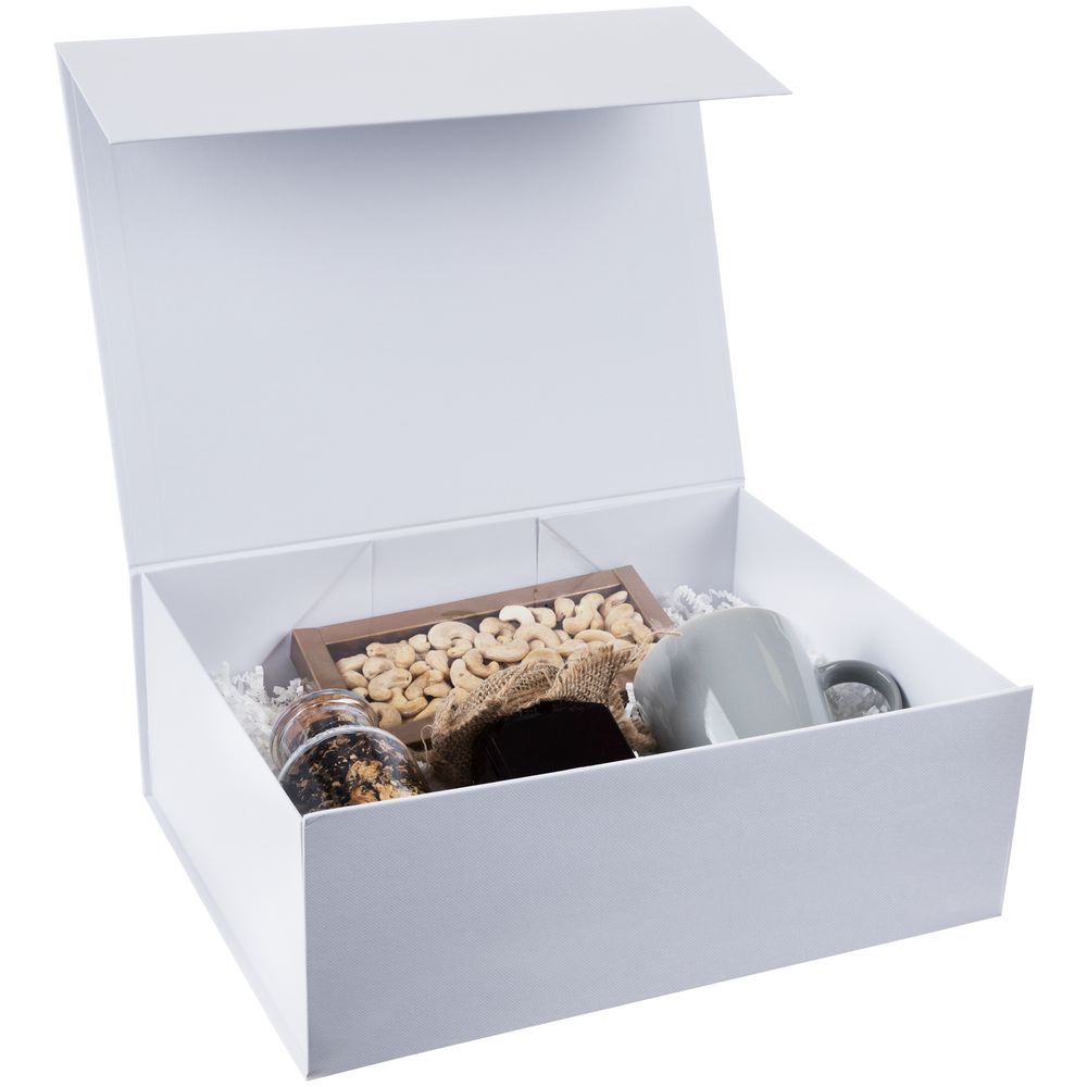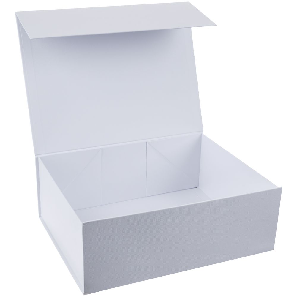 Коробка из переплетного картона, кашированного тисненой тонированной в массе бумагой, с крышкой на магните. Толщина картона 2 мм. Поставляется в плоском виде. Сборка осуществляется на скотч.