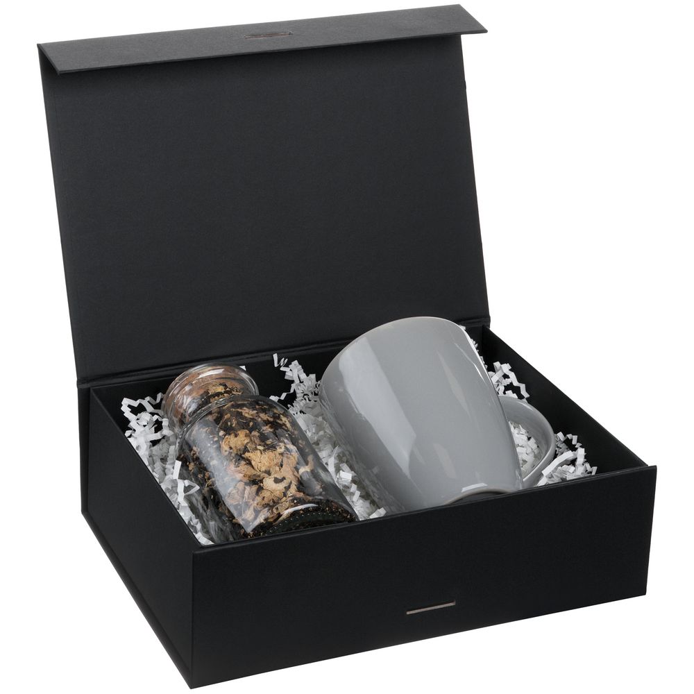 Коробка из переплетного картона, кашированного тонированной в массе крафтовой бумагой. Крышка на двух магнитах дополнительно фиксируется лентой.Толщина картона 2 мм.