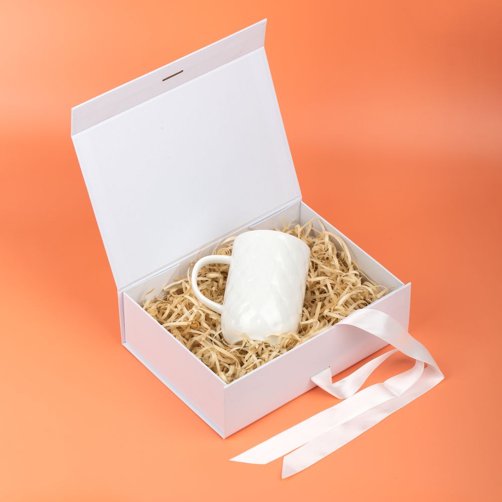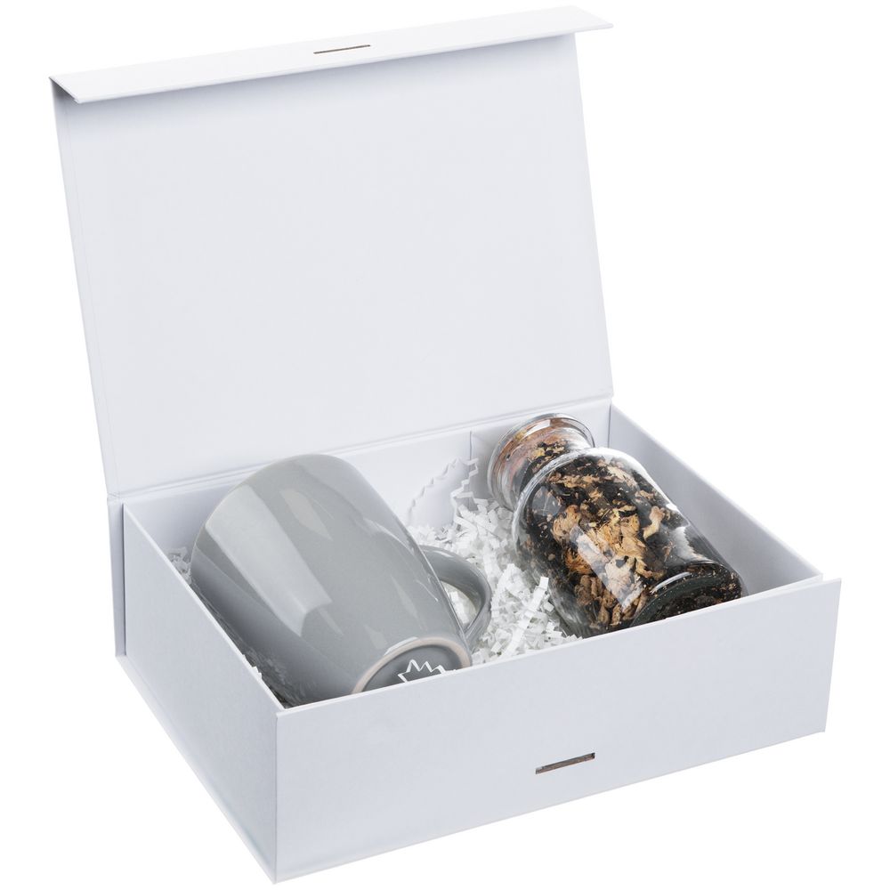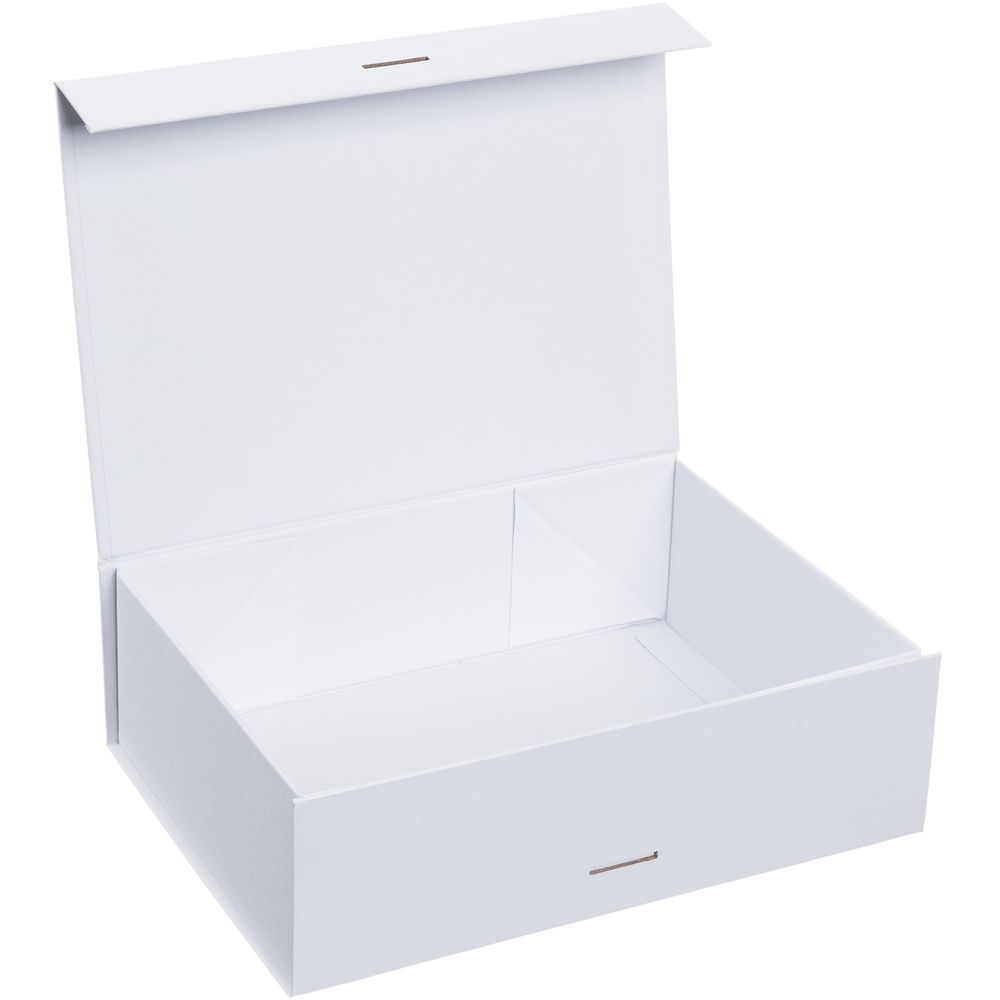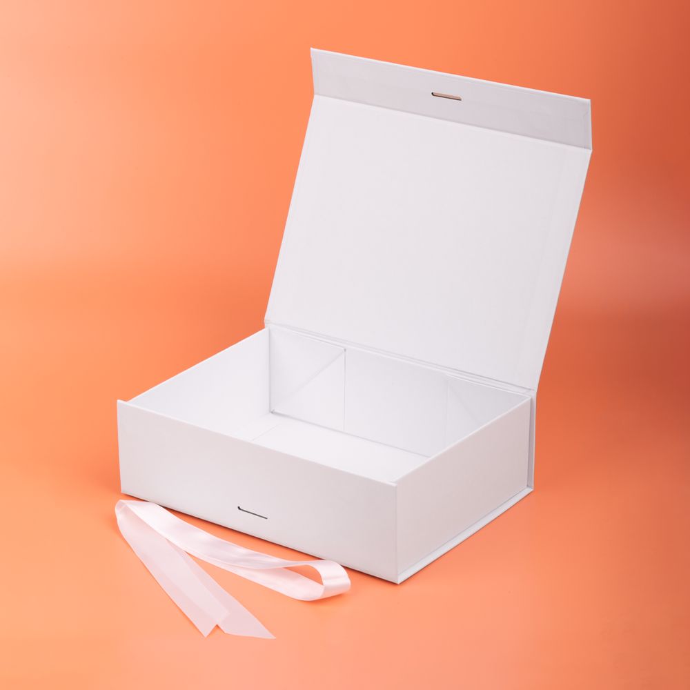 Коробка из переплетного картона, кашированного тонированной в массе крафтовой бумагой. Крышка на двух магнитах дополнительно фиксируется лентой.Толщина картона 2 мм. Длина ленты 80 см, ширина ленты 2,5 см. Поставляется в плоском виде. Сборка осуществляется на скотч.