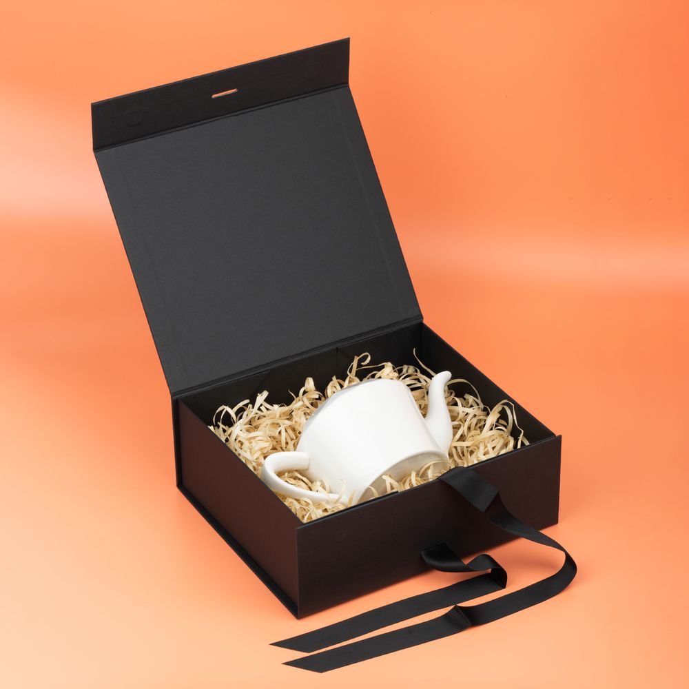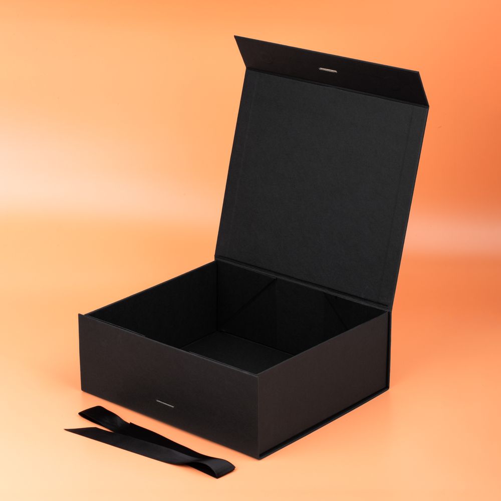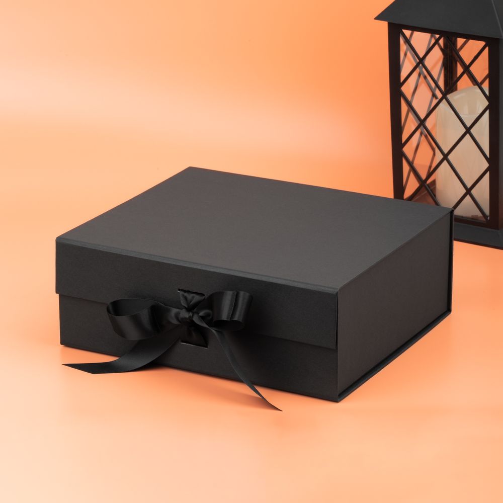 Коробка из переплетного картона, кашированного тонированной в массе крафтовой бумагой. Крышка на двух магнитах дополнительно фиксируется лентой.Толщина картона 2 мм. Длина ленты 80 см, ширина ленты 2,5 см. Поставляется в плоском виде. Сборка осуществляется на скотч.