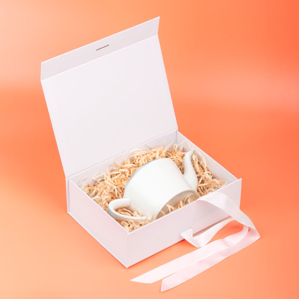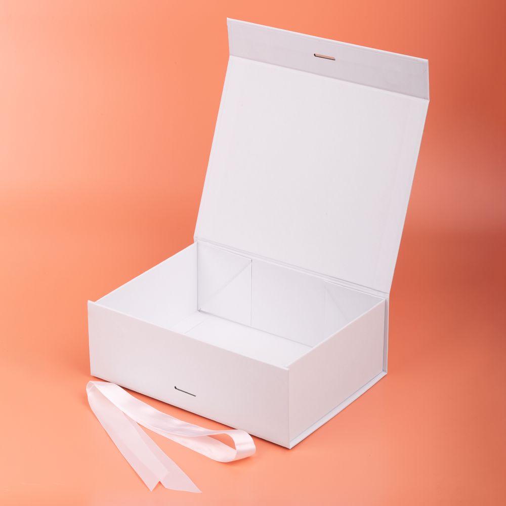 Коробка из переплетного картона, кашированного тонированной в массе крафтовой бумагой. Крышка на двух магнитах дополнительно фиксируется лентой.Толщина картона 2 мм. Длина ленты 80 см, ширина ленты 2,5 см. Поставляется в плоском виде. Сборка осуществляется на скотч.