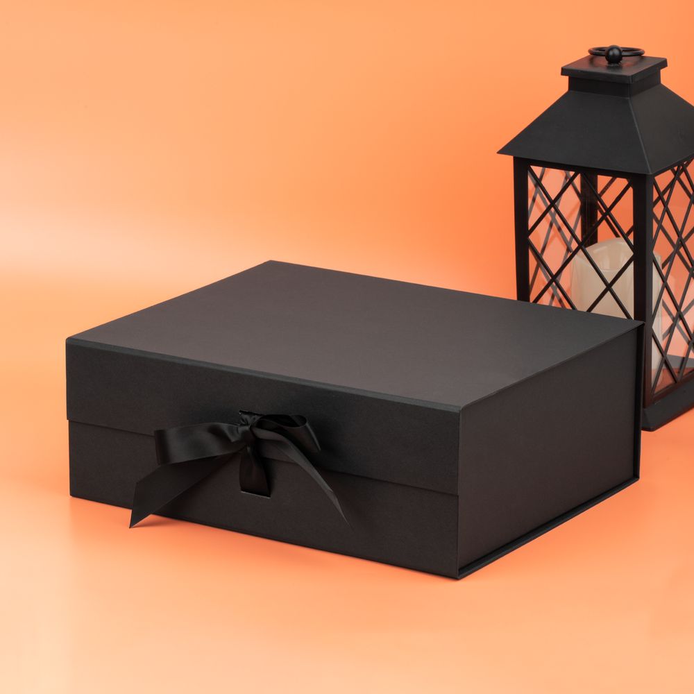 Коробка из переплетного картона, кашированного тонированной в массе крафтовой бумагой. Крышка на двух магнитах дополнительно фиксируется лентой.Толщина картона 2 мм. Поставляется в плоском виде. Сборка осуществляется на скотч.