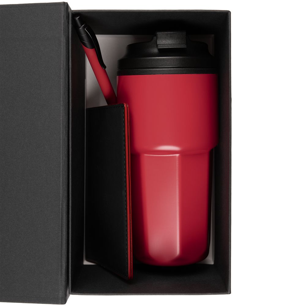 термостакан - нержавеющая сталь, полипропилен; обложка для паспорта - искусственная кожа; ручка - металл, пластик; коробка - переплетный картон