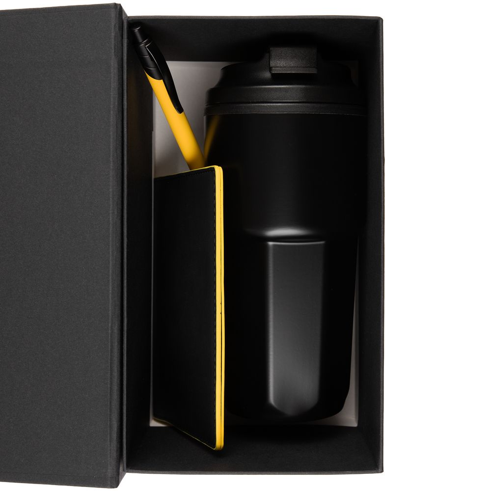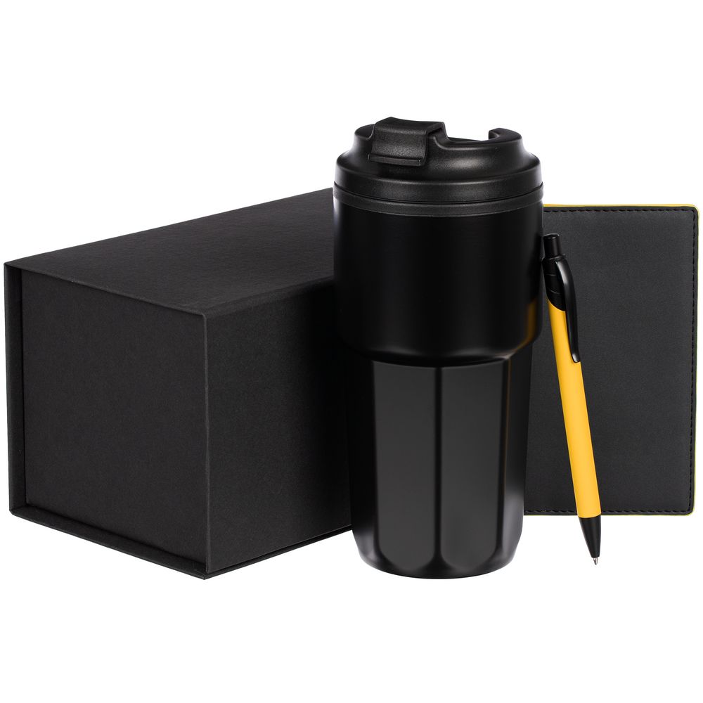термостакан - нержавеющая сталь, полипропилен; обложка для паспорта - искусственная кожа; ручка - металл, пластик; коробка - переплетный картон