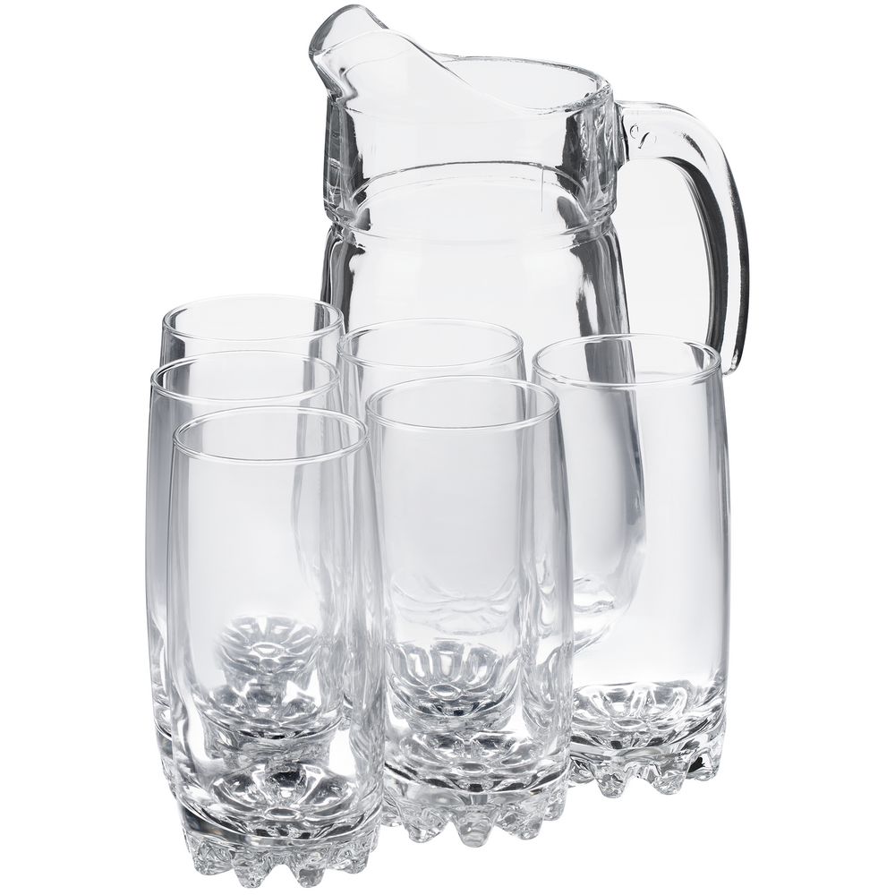 Набор Sylvana включает 6 стаканов и кувшин из прочного и качественного стекла. Элегантный и оригинальный дизайн набора добавит удовольствия от употребления напитков во время праздничного застолья и каждый день. В наборе кувшин и 6 стаканов. Емкость кувшина 1,35 л. Емкость стакана 0,387 л. Поставляется в индивидуальной упаковке.