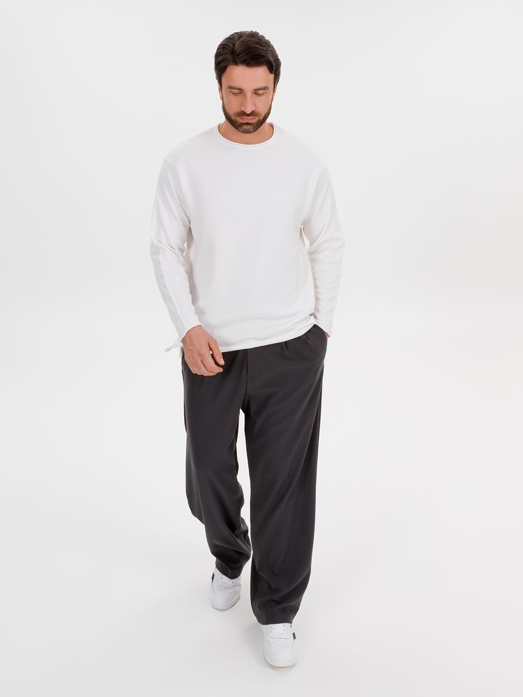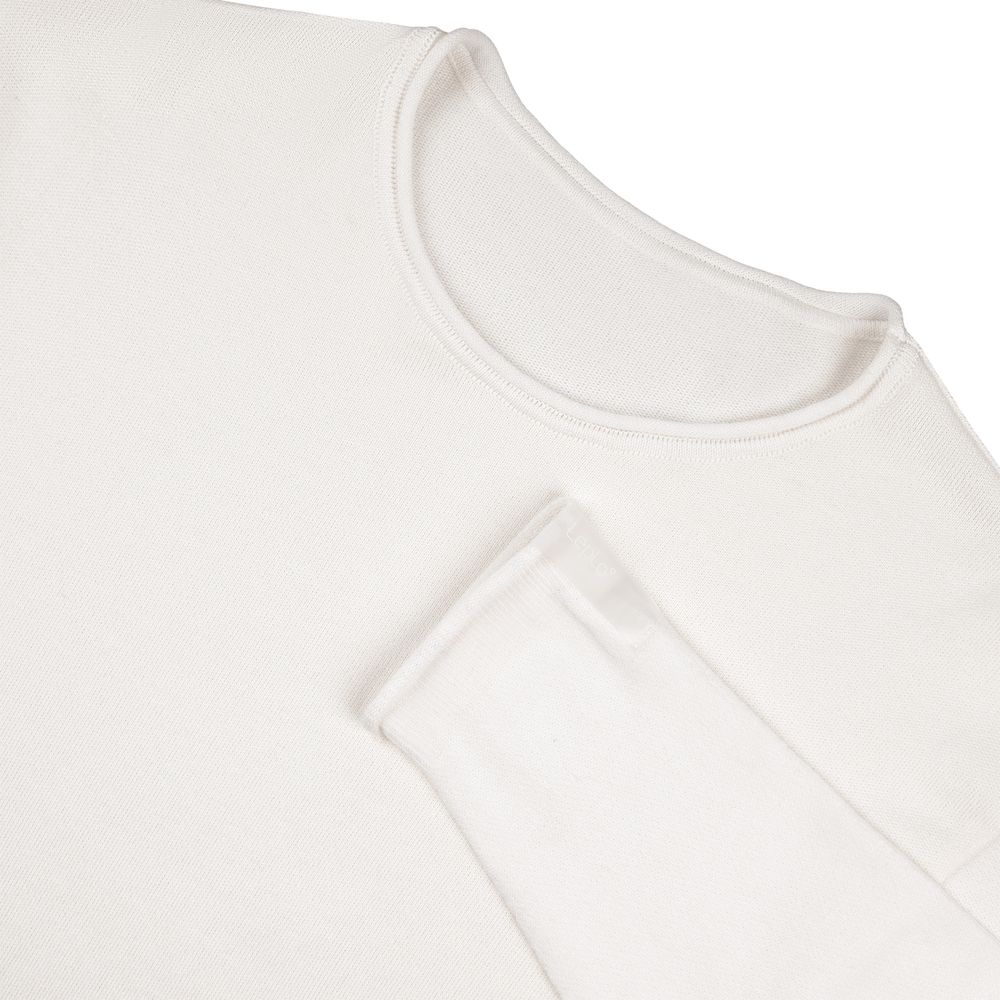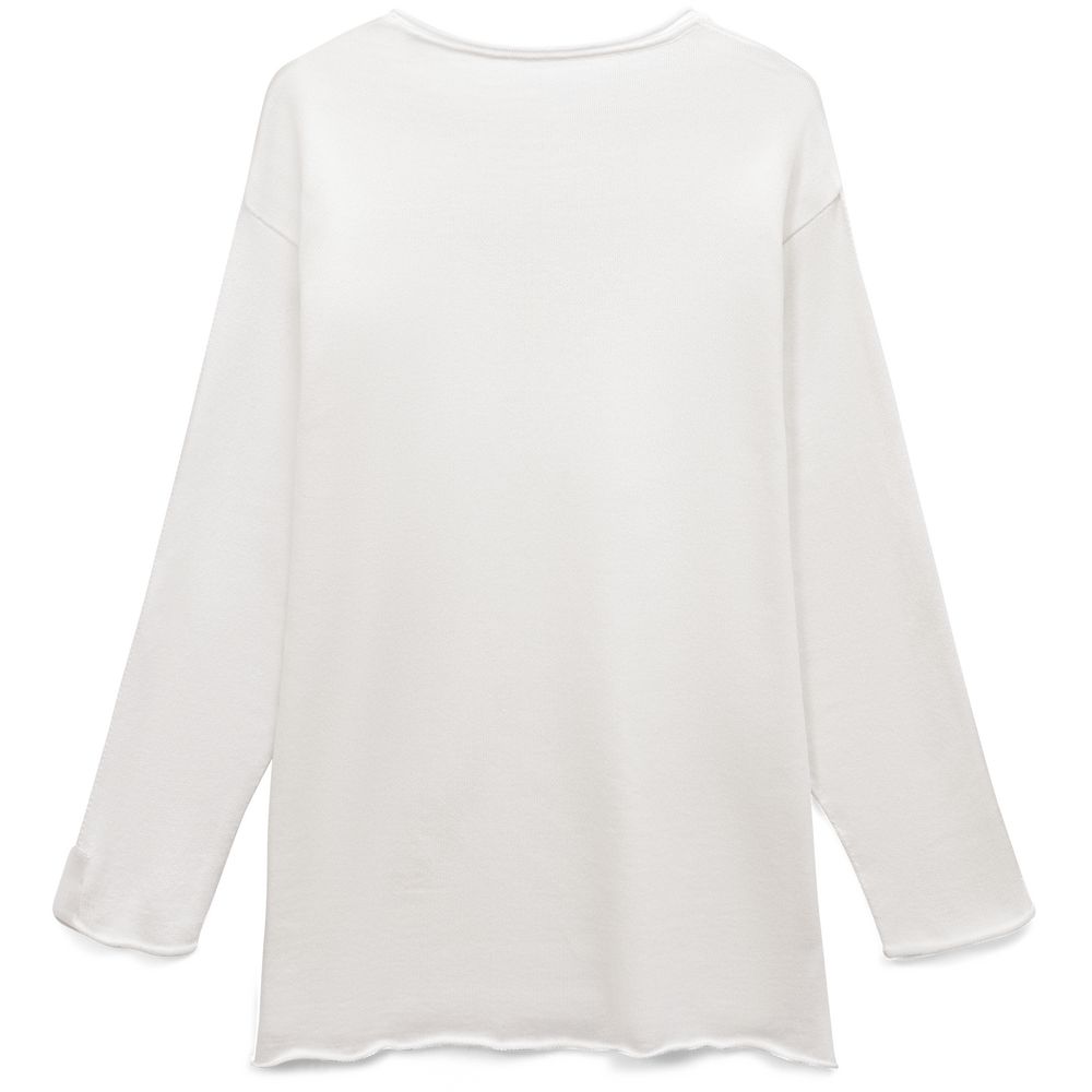 Siluetti. Силуэты уверенного будущего. Лонгслив Fuori средней плотности с широким воротом, спущенной линией плеча и свободно подворачивающимися краями по низу, на рукавах и вороте, которые добавляют модели еще большей расслабленности. Прозрачная бирка с логотипом бренда на рукаве не нарушает минималистичности образа.