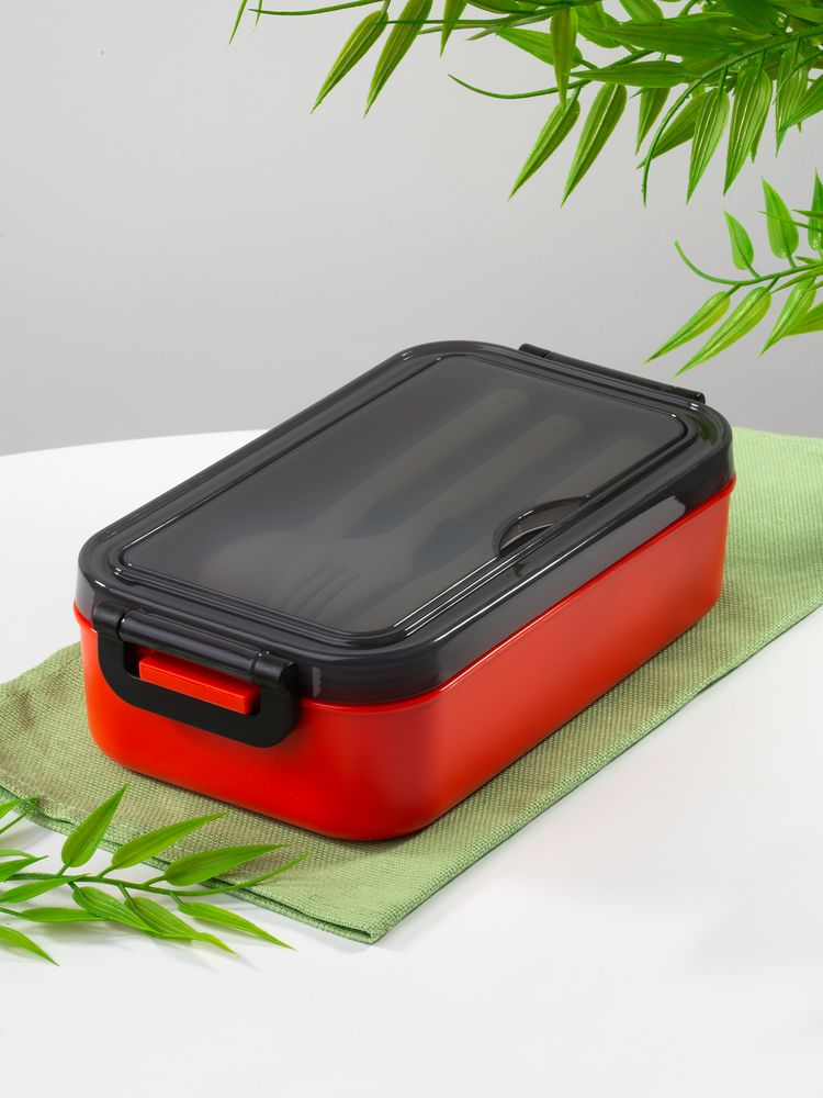 Удобная конструкция с крышкой на защелках обеспечивает надежную фиксацию. Специальное отделение под крышкой позволяет хранить столовые приборы, освобождая дополнительное пространство в сумке.