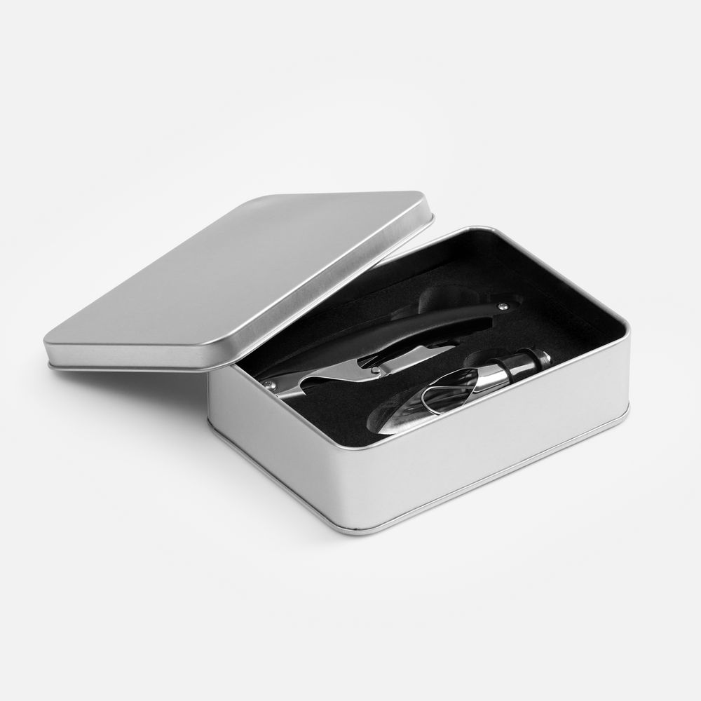 Набор упакован в жестяную коробку с ложементом.