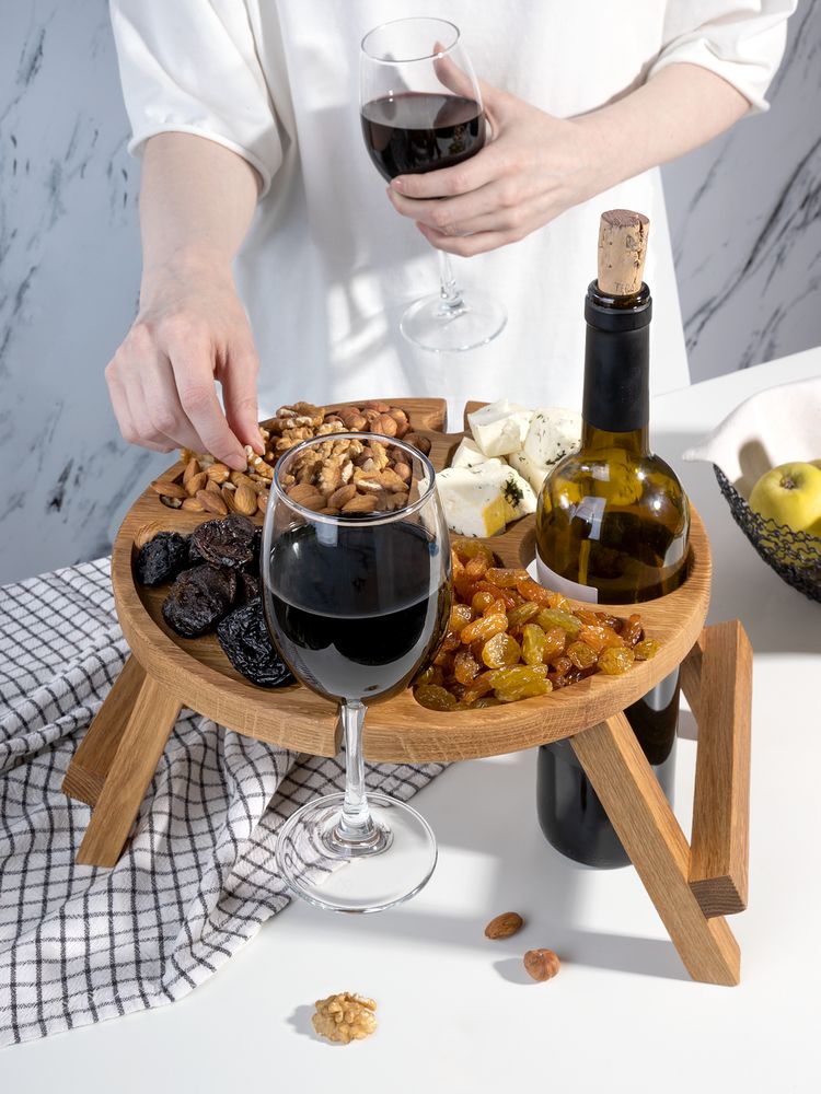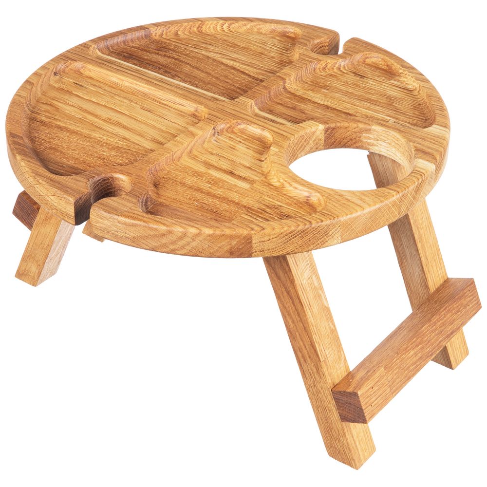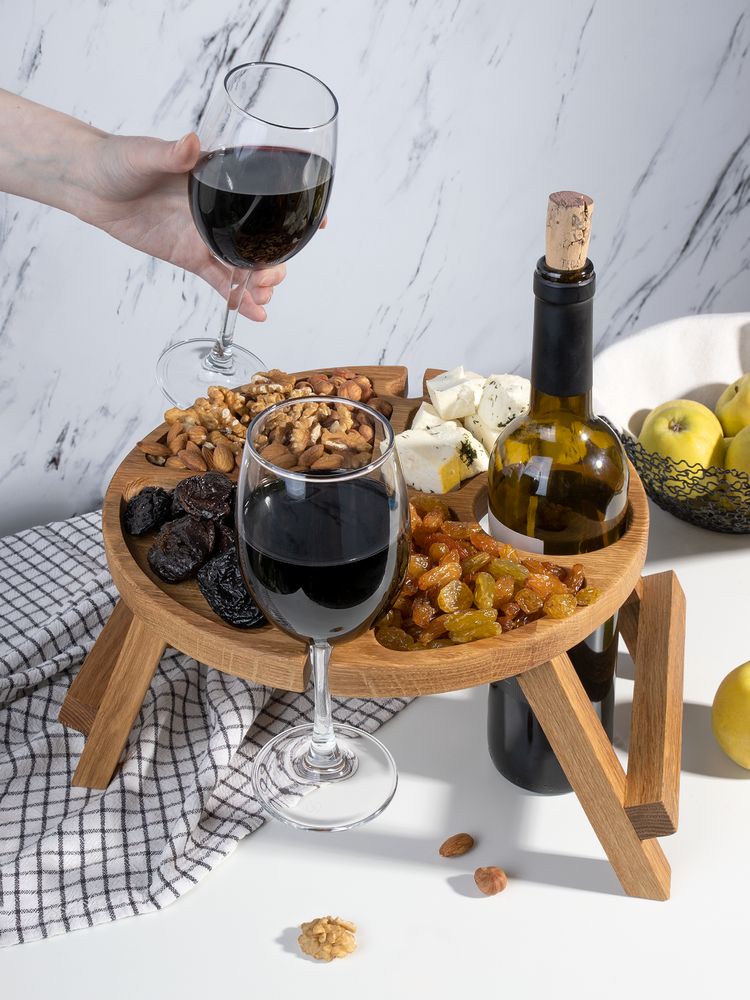 С винным столиком Taffon все необходимое для идеального вечера всегда будет под рукой! Удобные углубления для двух бокалов и специальное место для бутылки просто созданы для безмятежного наслаждения любимыми напитками. Продуманные отсеки для изысканных закусок позволят добавить изюминку любому ужину и превратить его в настоящий гастрономический праздник! Ножки стола легко складываются — мобильность и удобство в путешествиях.Поставляется без индивидуальной упаковки.