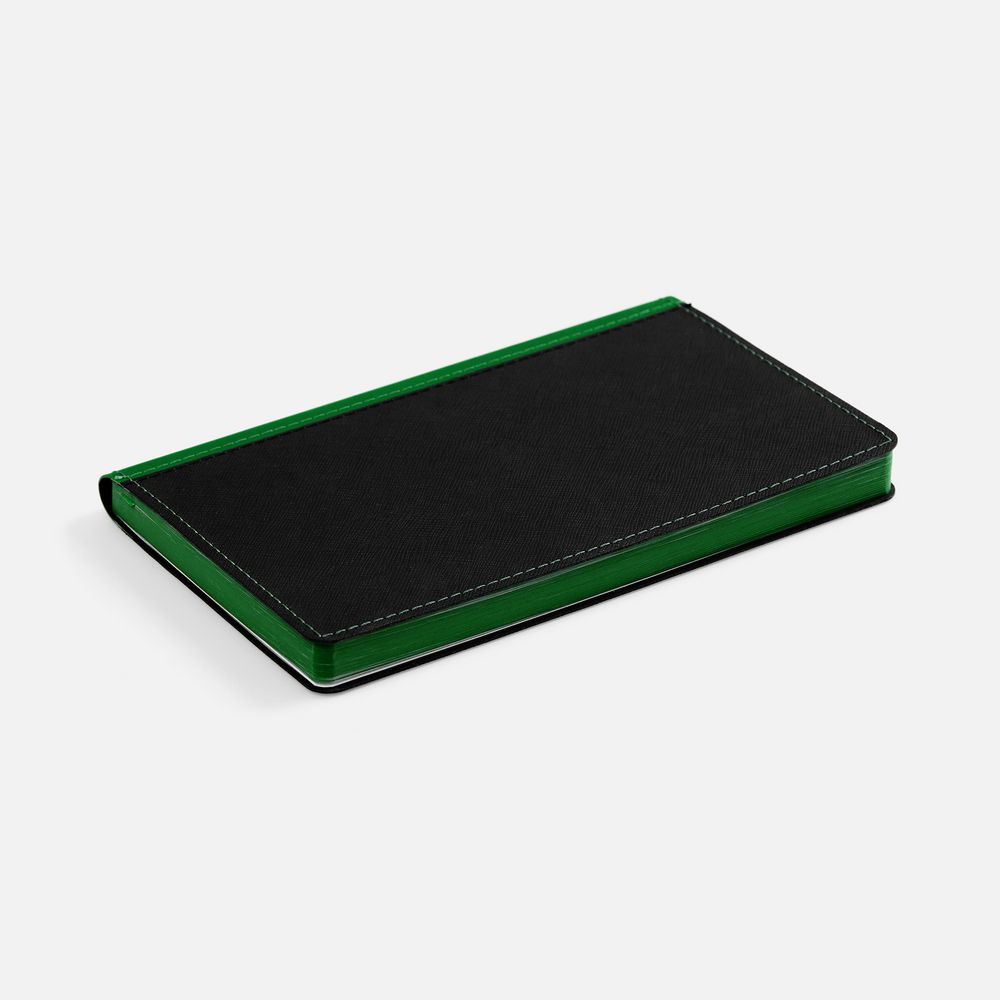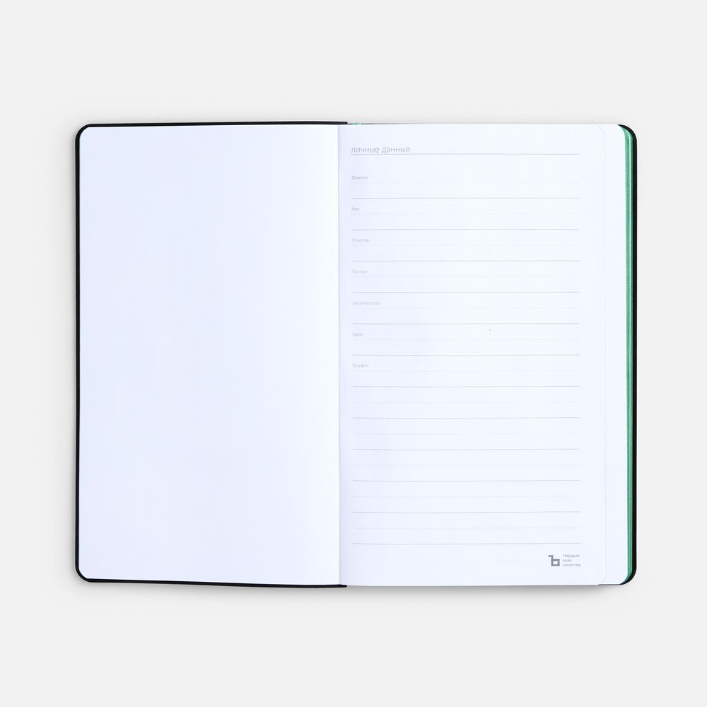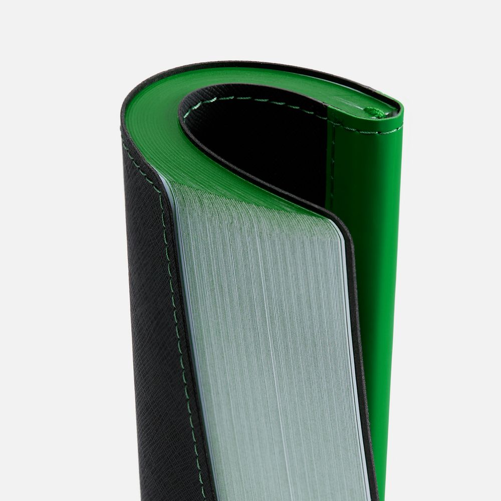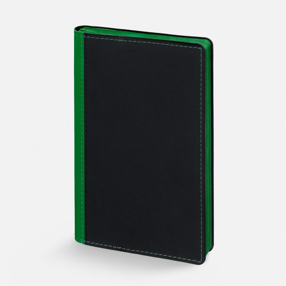 Ежедневник с гибкой обложкой выполнен из материала Nice Touch, черный АА и Soft Touch Ultra, зеленый FF, дополнен ляссе зеленого цвета.