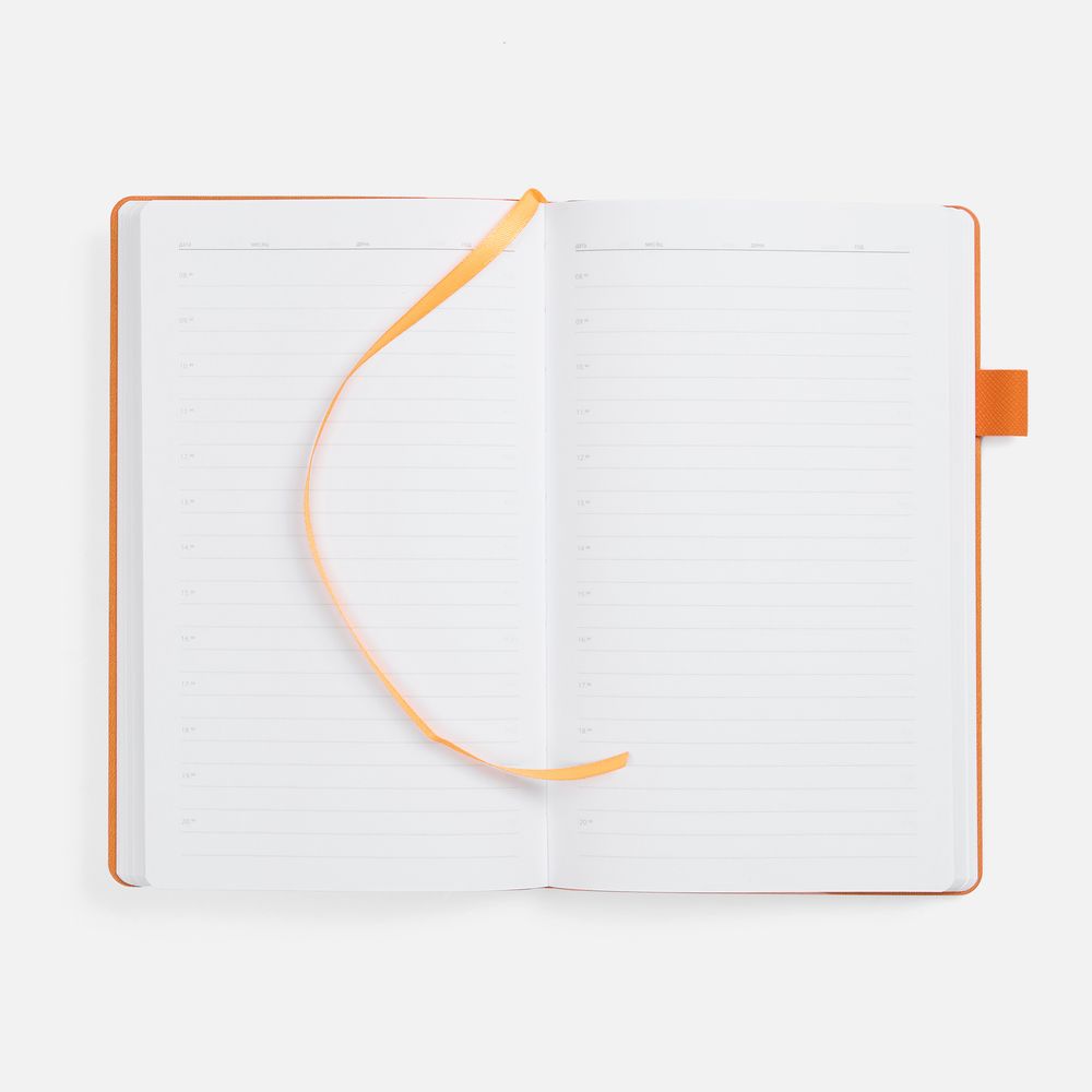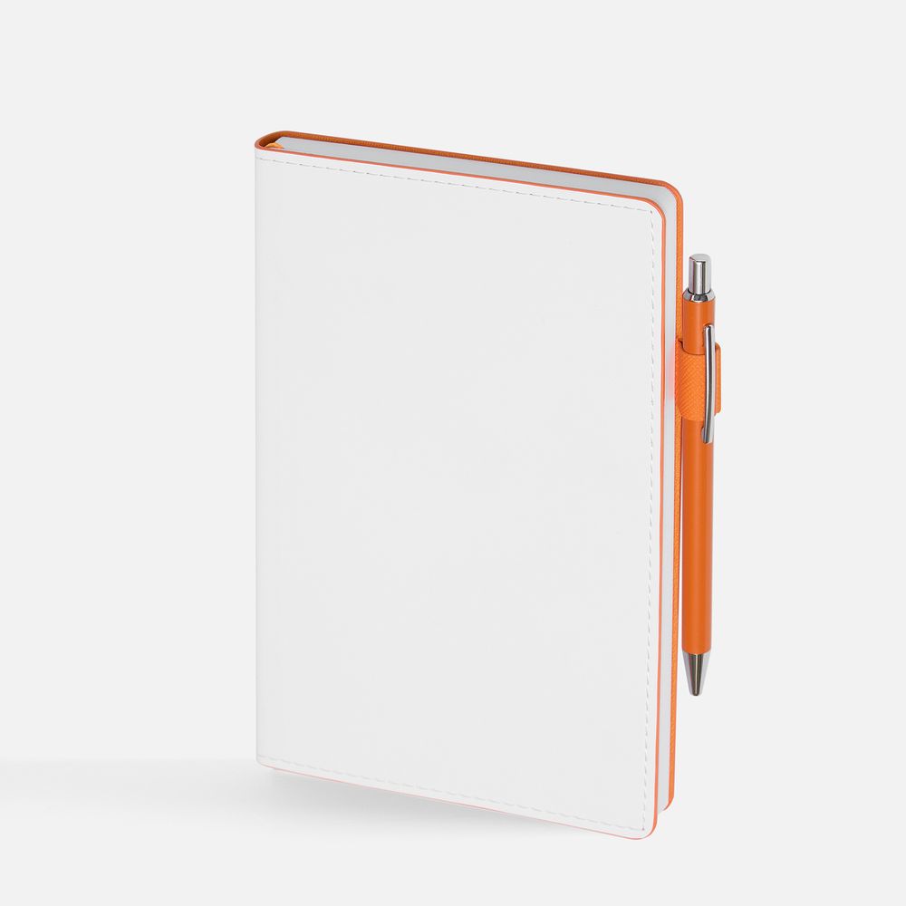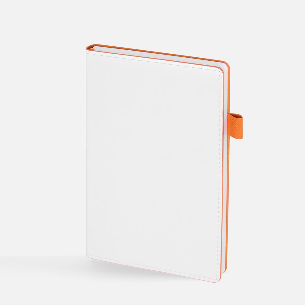 Гибкая обложка, материал обложки — Soft Touch, белый BB и Latte, оранжевый ОО; материал петли для ручки — Nice Touch, оранжевый ОО. Срез обложки окрашен в оранжевый цвет.