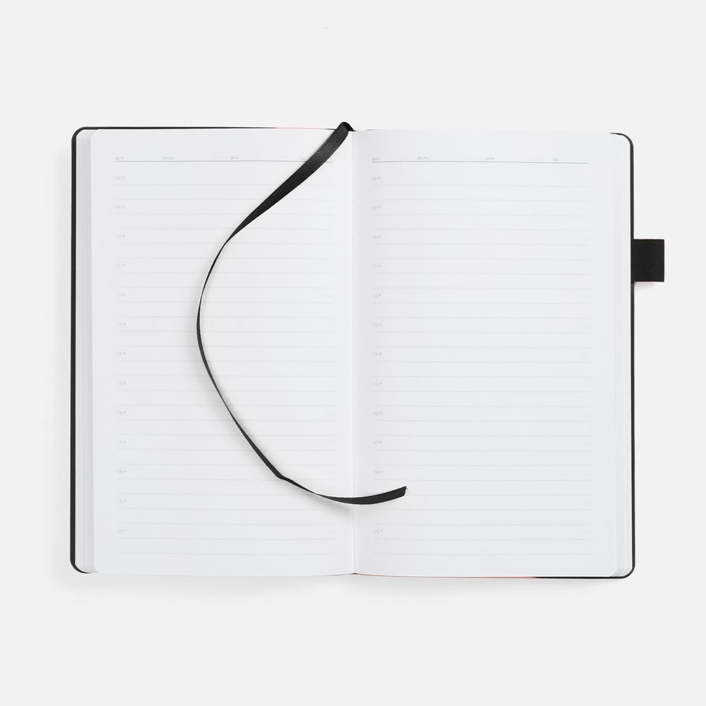 Гибкая обложка, материал обложки — Soft Touch, белый BB и Latte, черный АА; материал петли для ручки — Nice Touch, черный АА. Срез обложки окрашен в черный цвет.