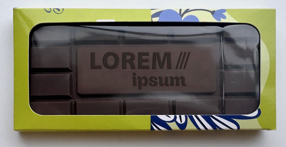 Шоколад упакован в подарочную коробку и индивидуальный флоу-пак. Ламинация коробки: матовая или глянцевая.Шоколад изготовлен из сырья бельгийской компании Barry Callebaut.